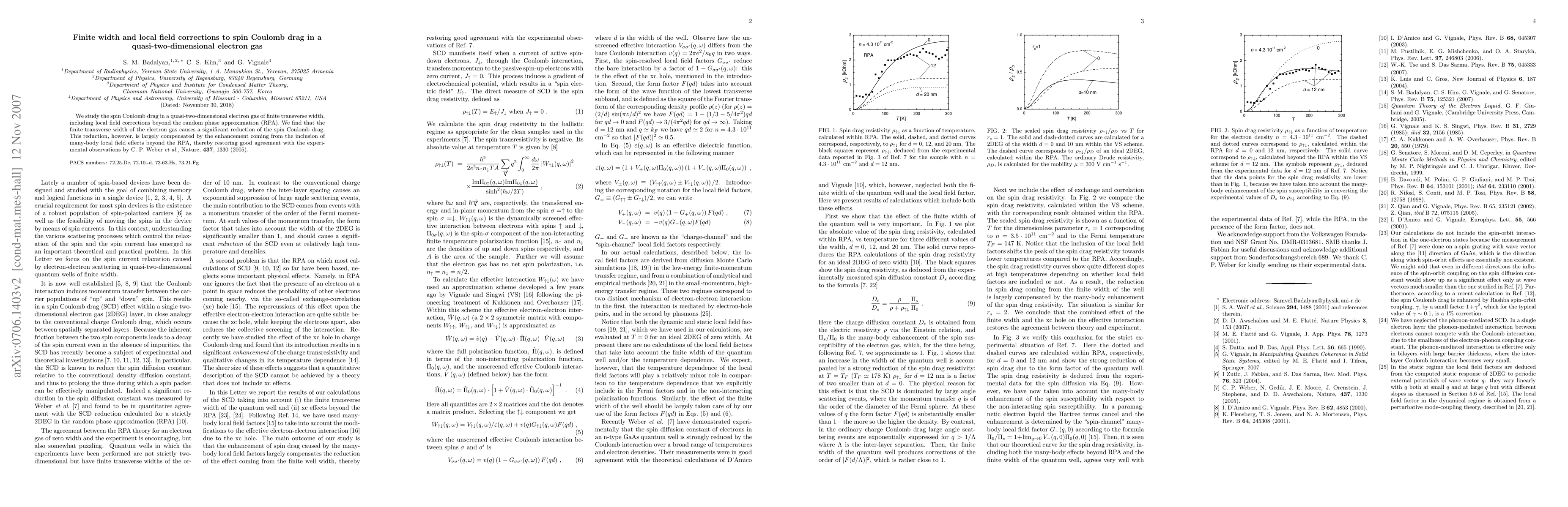 The paper introduces many-body local field corrections beyond the RPA to accurately model spin Coulomb drag in a quasi-two-dimensional electron gas with finite transverse width.