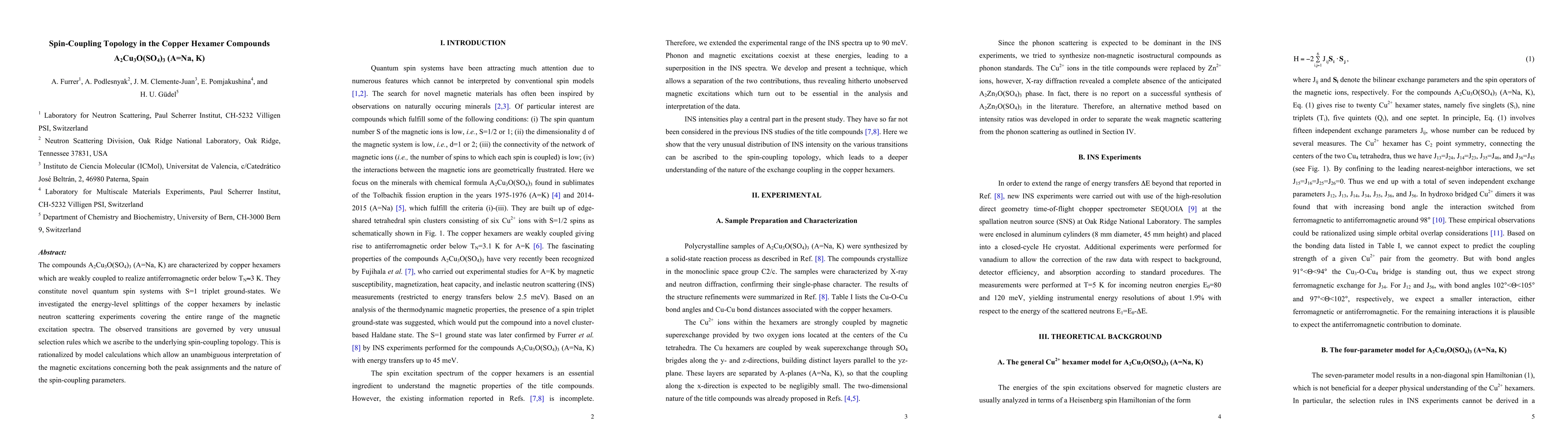 The paper investigates the spin-coupling topology in copper hexamer compounds A$_2$Cu$_3$O(SO$_4$)$_3$ (A=Na, K), revealing antiferromagnetic order below 3 K and S=1 triplet ground-states. Inelastic neutron scattering experiments reveal unusual selection rules and energy-level splittings, interpreted through model calculations.