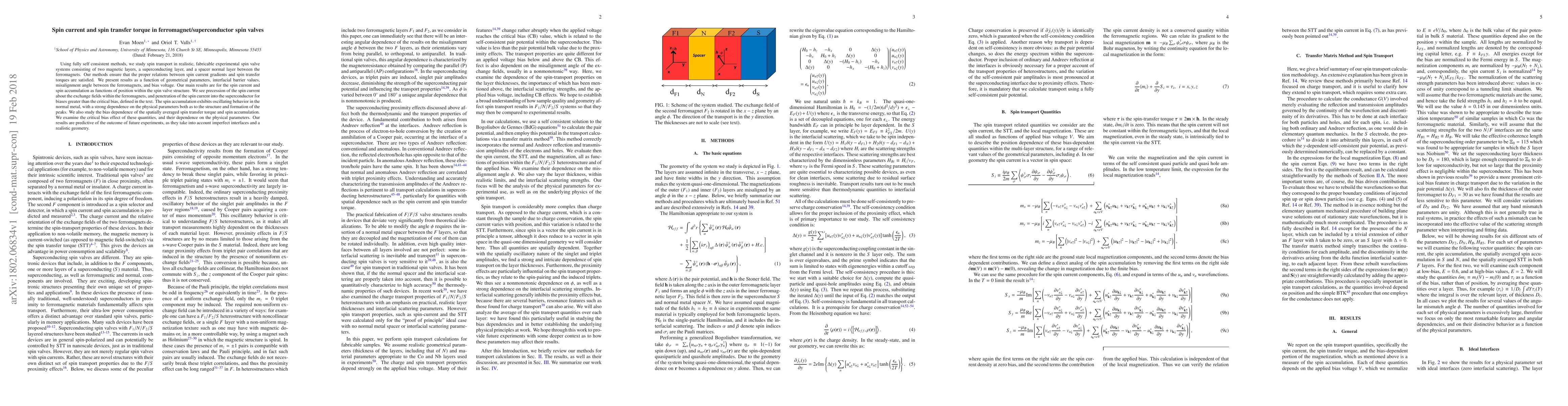 Using fully self consistent methods, we study spin transport in realistic, fabricable experimental spin valve systems consisting of two magnetic layers, a superconducting layer, and a spacer normal layer between the ferromagnets. Our methods ensure that the proper relations between spin current gradients and spin transfer torques are satisfied. We present results as a function of geometrical parameters, interfacial barrier values, misalignment angle between the ferromagnets, and bias voltage. Our main results are for the spin current and spin accumulation as functions of position within the spin valve structure. We see precession of the spin current about the exchange fields within the ferromagnets, and penetration of the spin current into the superconductor for biases greater than the critical bias, defined in the text. The spin accumulation exhibits oscillating behavior in the normal metal, with a strong dependence on the physical parameters both as to the structure and formation of the peaks. We also study the bias dependence of the spatially averaged spin transfer torque and spin accumulation. We examine the critical bias effect of these quantities, and their dependence on the physical parameters. Our results are predictive of the outcome of future experiments, as they take into account imperfect interfaces and a realistic geometry.