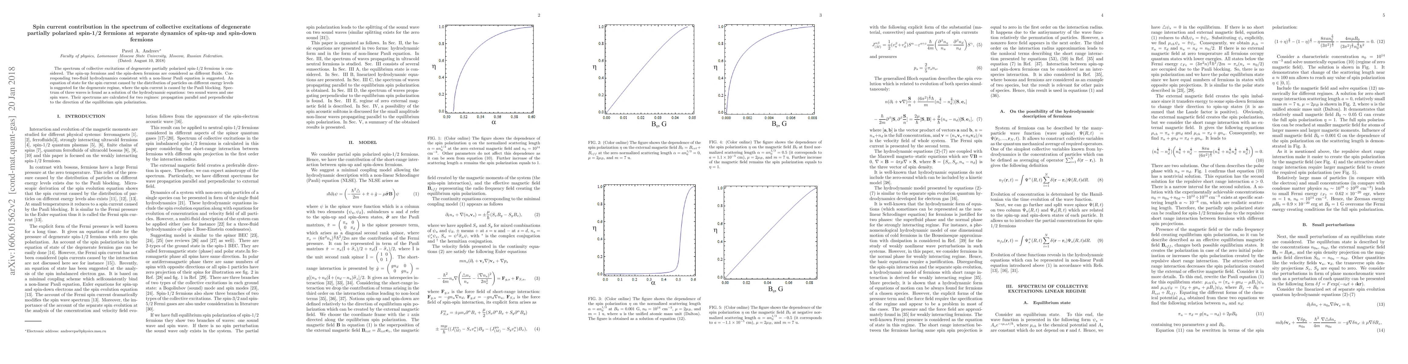 The spectrum of collective excitations of degenerate partially polarized spin-1/2 fermions is considered. The spin-up fermions and the spin-down fermions are considered as different fluids. Corresponding two-fluid hydrodynamics consistent with a non-linear Pauli equation is suggested. An equation of state for the spin current caused by the distribution of particles on different energy levels is suggested for the degenerate regime, where the spin current is caused by the Pauli blocking. Spectrum of three waves is found as a solution of the hydrodynamic equations: two sound waves and one spin wave. Their spectrums are calculated for two regimes: propagation parallel and perpendicular to the direction of the equilibrium spin polarization.