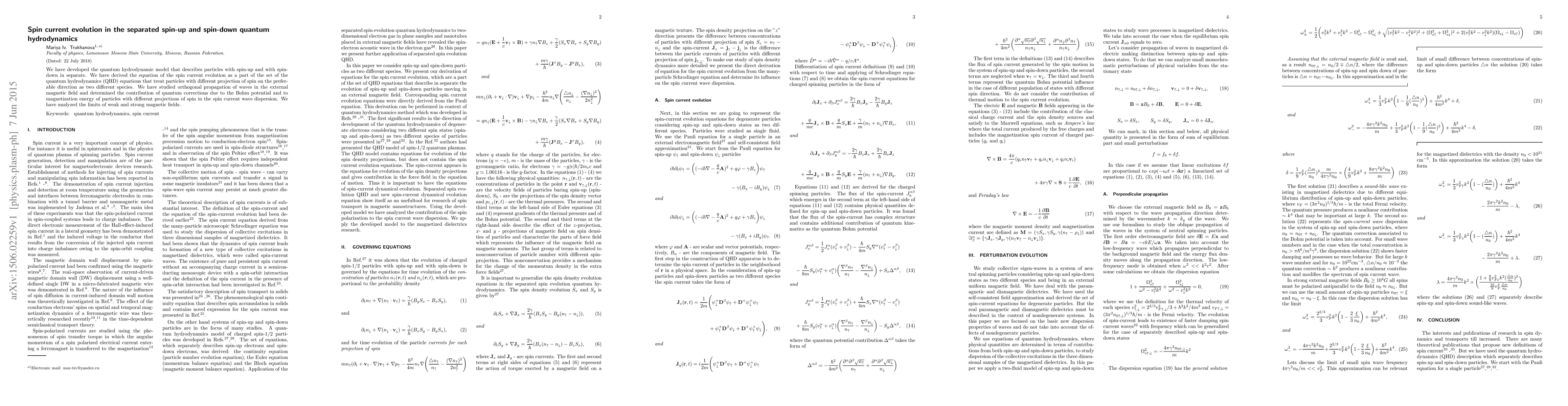 This paper develops a quantum hydrodynamic model for spin-up and spin-down particles treated separately, deriving equations for spin current evolution. It examines wave propagation in magnetic fields, considering quantum corrections and analyzing both weak and strong magnetic field limits.