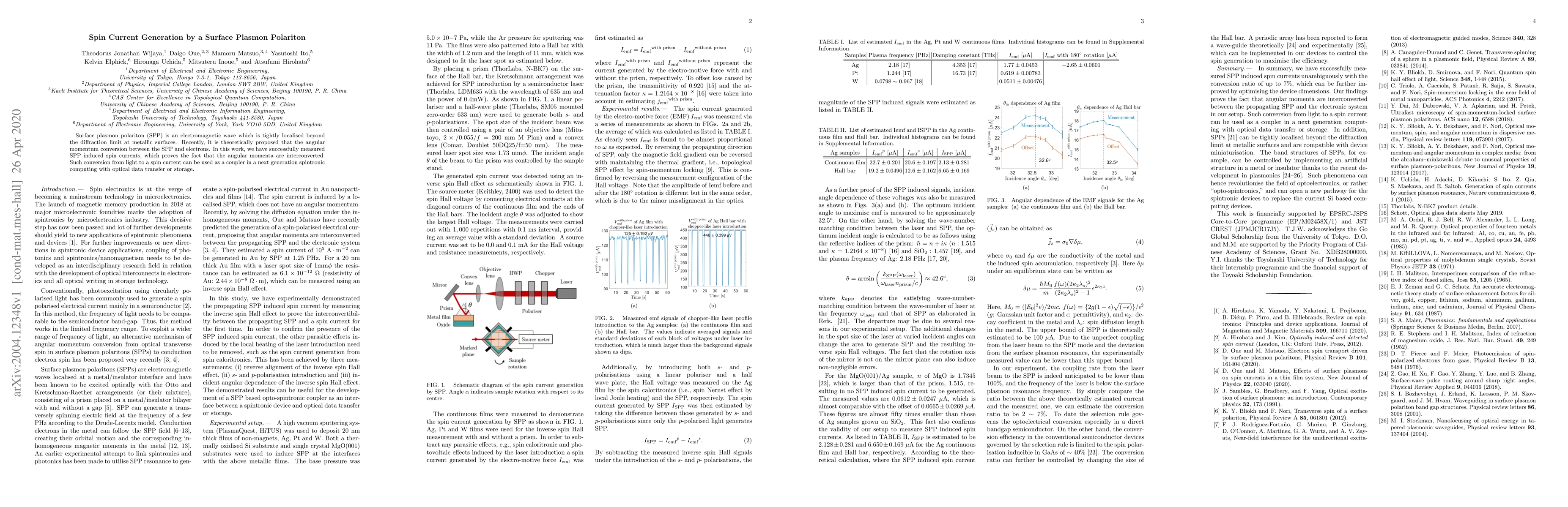 This paper demonstrates the successful measurement of spin currents generated by surface plasmon polaritons, confirming the theoretical proposal of angular momentum conversion between SPPs and electrons. This discovery holds potential for next-generation spintronic devices utilizing optical data transfer or storage.