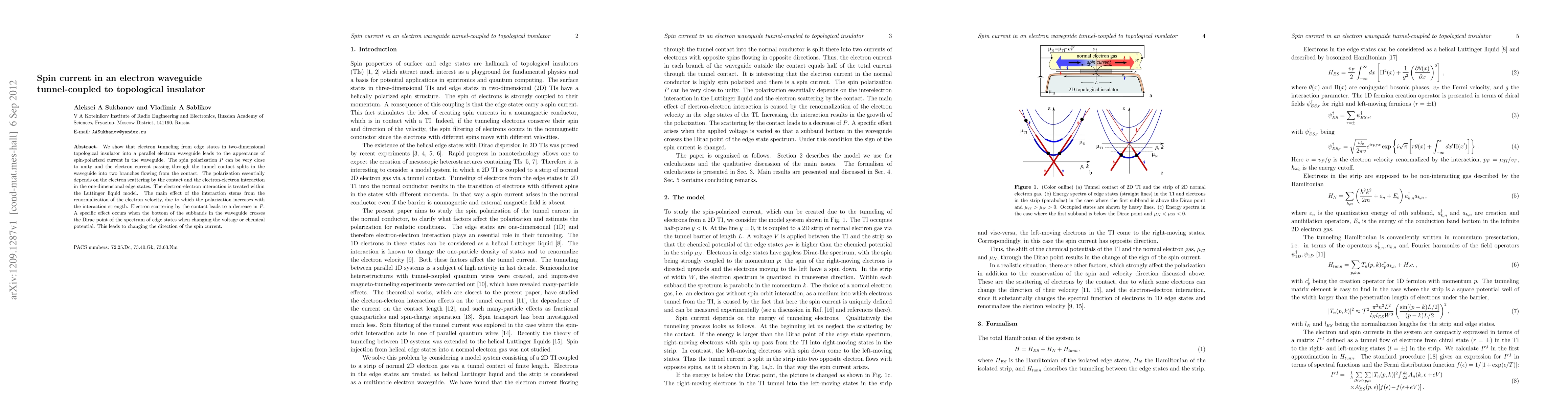 We show that electron tunneling from edge states in two-dimensional topological insulator into a parallel electron waveguide leads to the appearance of spin-polarized current in the waveguide. The spin polarization $P$ can be very close to unity and the electron current passing through the tunnel contact splits in the waveguide into two branches flowing from the contact. The polarization essentially depends on the electron scattering by the contact and the electron-electron interaction in the one-dimensional edge states. The electron-electron interaction is treated within the Luttinger liquid model. The main effect of the interaction stems from the renormalization of the electron velocity, due to which the polarization increases with the interaction strength. Electron scattering by the contact leads to a decrease in $P$. A specific effect occurs when the bottom of the subbands in the waveguide crosses the Dirac point of the spectrum of edge states when changing the voltage or chemical potential. This leads to changing the direction of the spin current.