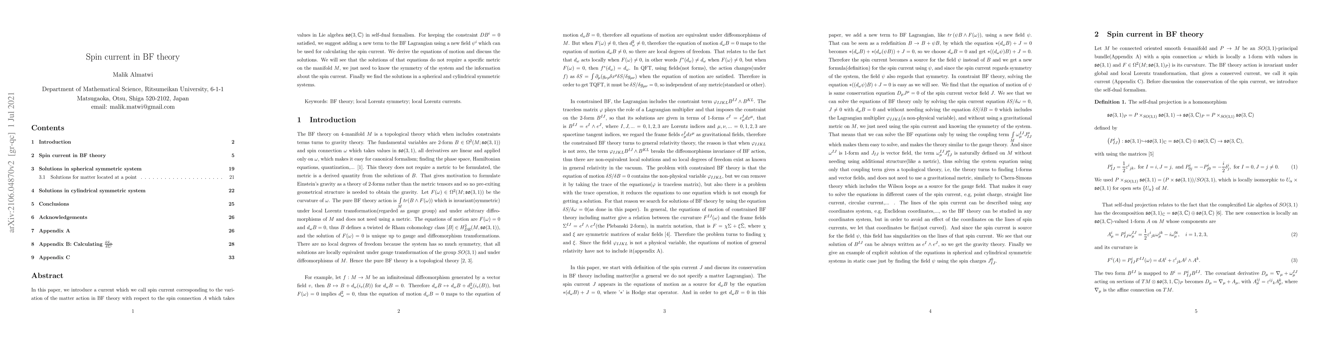 In this paper, we introduce a current which we call spin current corresponding to the variation of the matter action in BF theory with respect to the spin connection $A$ which takes values in Lie algebra $\mathfrak{so}(3,\mathbb{C})$ in self-dual formalism. For keeping the constraint $DB^i=0$ satisfied, we suggest adding a new term to the BF Lagrangian using a new field $\psi^i$ which can be used for calculating the spin current. We derive the equations of motion and discuss the solutions. We will see that the solutions of that equations do not require a specific metric on the manifold $M$, we just need to know the symmetry of the system and the information about the spin current. Finally we find the solutions in a spherical and cylindrical symmetric systems.
