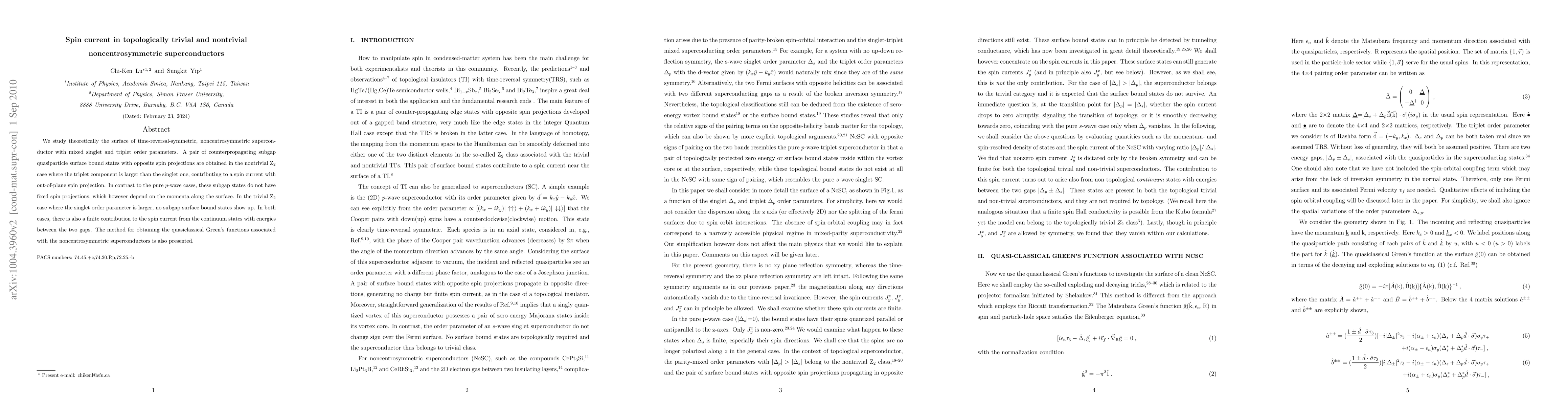 Theoretical research on superconductors with noncentrosymmetric order parameters reveals spin currents in both trivial and nontrivial cases, arising from subgap quasiparticle states and continuum states.