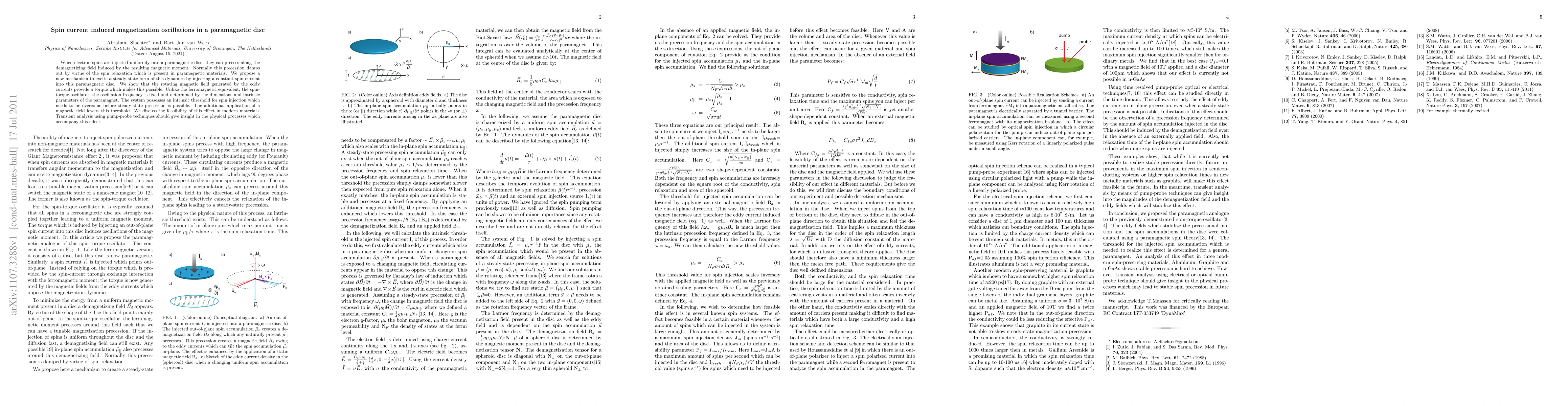 Researchers discovered a way to induce magnetization oscillations in paramagnetic discs using constant spin currents, which can overcome the natural damping of spin relaxation. This effect has fixed frequency determined by material dimensions and parameters, with an intrinsic threshold that can be lowered by applying a magnetic field.