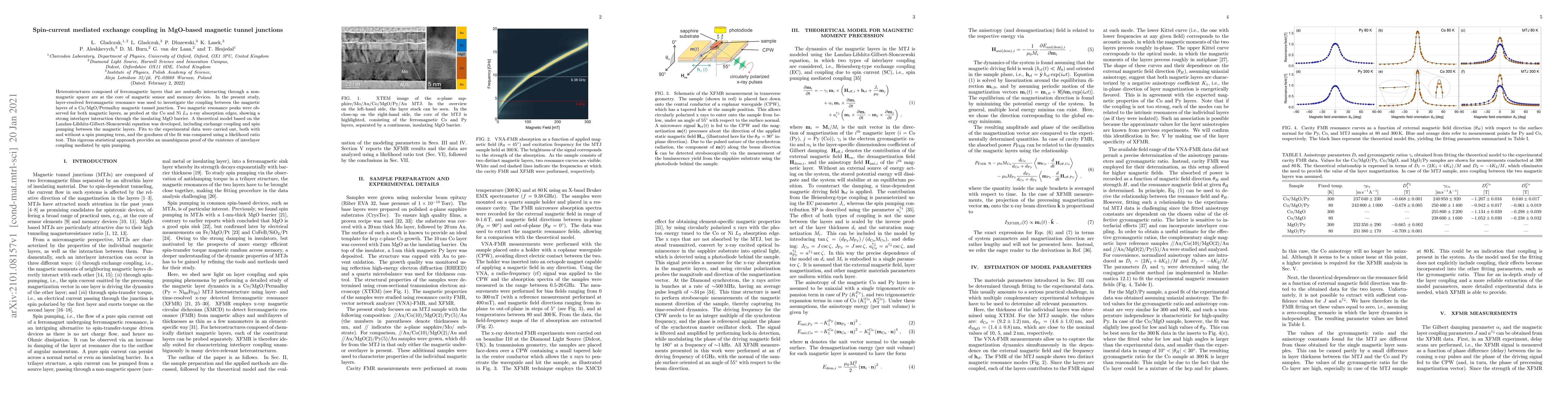 This paper investigates spin-current mediated exchange coupling in MgO-based magnetic tunnel junctions using layer-resolved ferromagnetic resonance. The study confirms strong interlayer interaction through the insulating MgO barrier, providing unambiguous proof of spin pumping-mediated coupling via a rigorous statistical comparison of theoretical models.