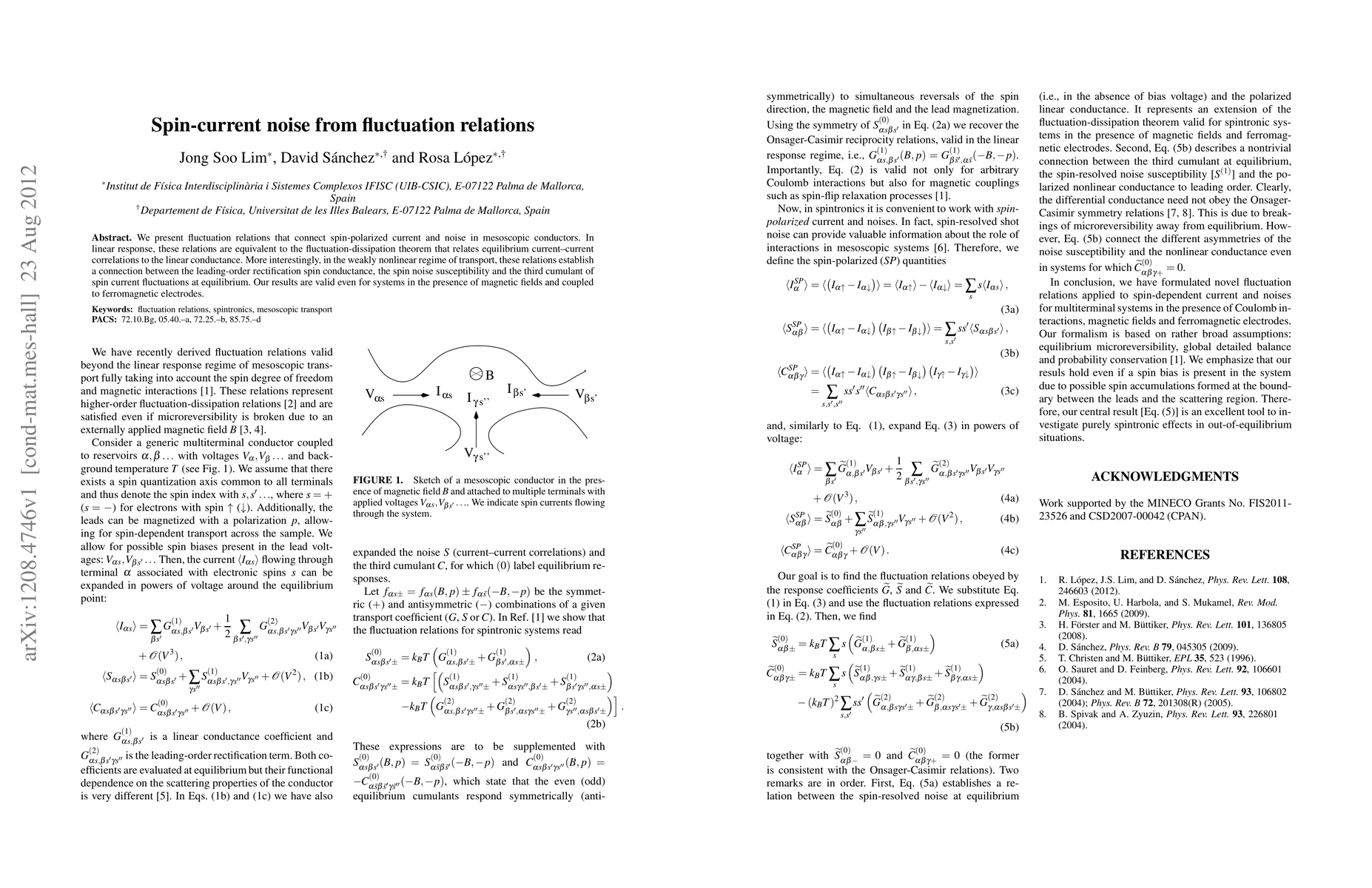 This paper establishes fluctuation relations linking spin-polarized current noise and rectification in mesoscopic conductors, extending the fluctuation-dissipation theorem to the weakly nonlinear regime. The findings connect the spin noise susceptibility to the third cumulant of spin current fluctuations, valid even under magnetic fields and with ferromagnetic electrodes.