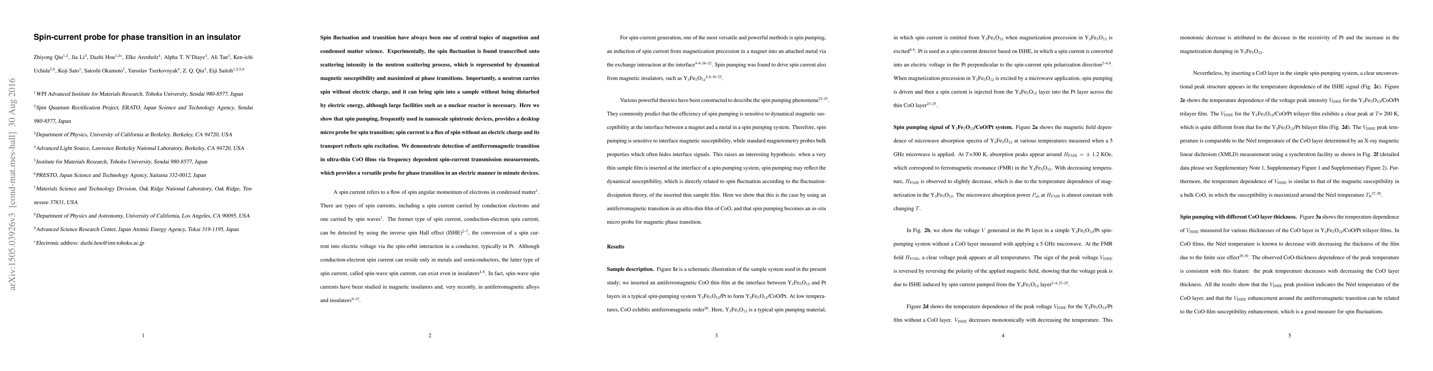Spin fluctuation and transition have always been one of central topics of magnetism and condensed matter science. Experimentally, the spin fluctuation is found transcribed onto scattering intensity in the neutron scattering process, which is represented by dynamical magnetic susceptibility and maximized at phase transitions. Importantly, a neutron carries spin without electric charge, and it can bring spin into a sample without being disturbed by electric energy, although large facilities such as a nuclear reactor is necessary. Here we show that spin pumping, frequently used in nanoscale spintronic devices, provides a desktop micro probe for spin transition; spin current is a flux of spin without an electric charge and its transport reflects spin excitation. We demonstrate detection of antiferromagnetic transition in ultra-thin CoO films via frequency dependent spin-current transmission measurements, which provides a versatile probe for phase transition in an electric manner in minute devices.