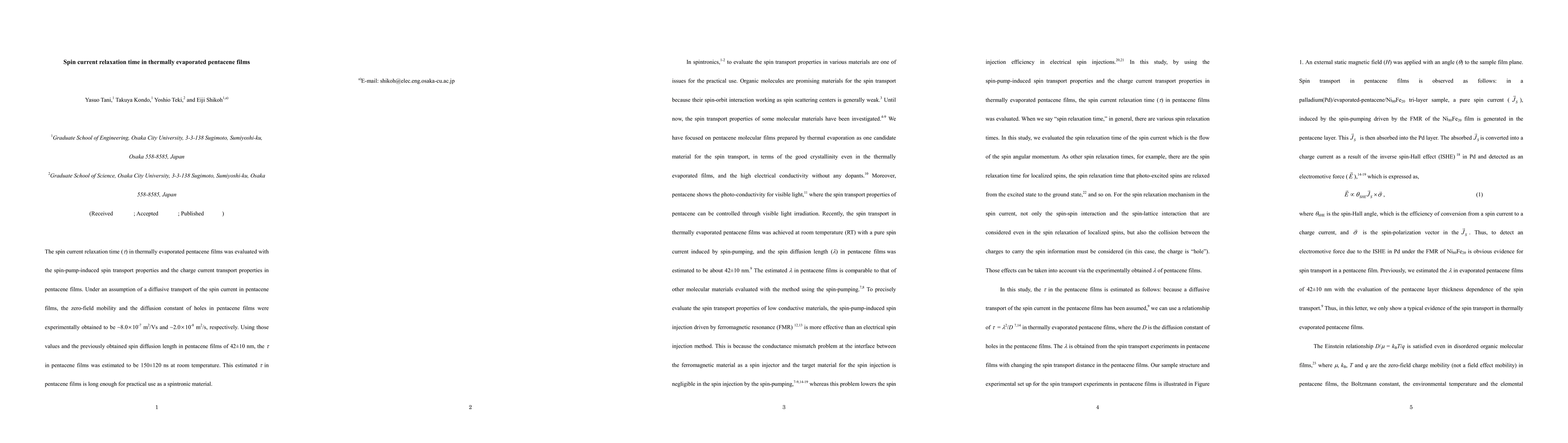 The spin current relaxation time [tau] in thermally evaporated pentacene films was evaluated with the spin-pump-induced spin transport properties and the charge current transport properties in pentacene films. Under an assumption of a diffusive transport of the spin current in pentacene films, the zero-field mobility and the diffusion constant of holes in pentacene films were experimentally obtained to be ~8.0x10^-7 m^2/Vs and ~2.0x10^-8 m^2/s, respectively. Using those values and the previously obtained spin diffusion length in pentacene films of 42{plus-minus}10 nm, the [tau] in pentacene films was estimated to be 150{plus-minus}120 ns at room temperature. This estimated [tau] in pentacene films is long enough for practical use as a spintronic material.