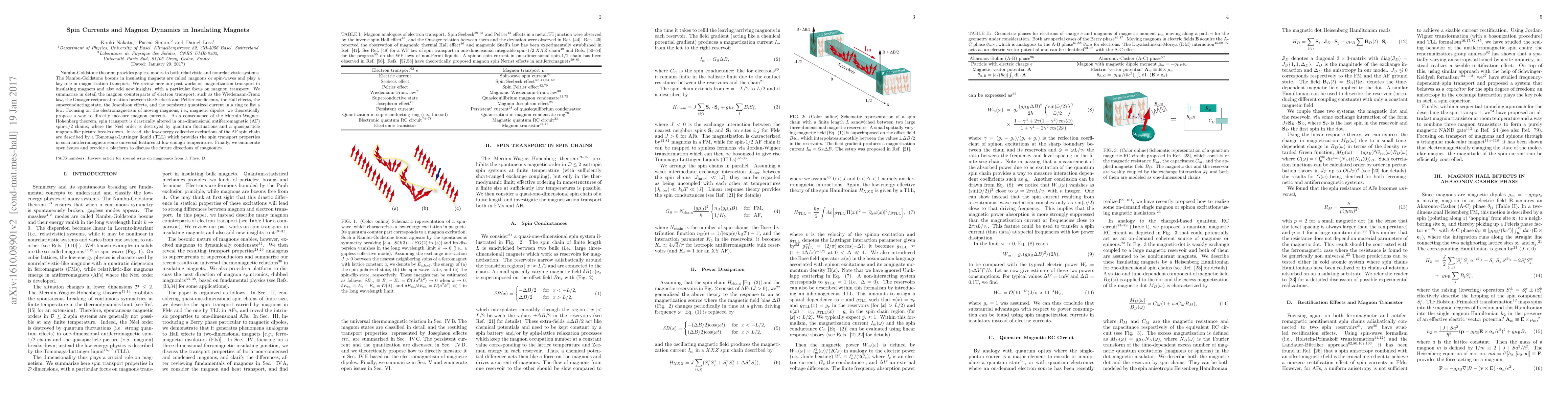 This paper reviews magnetization transport mechanisms in insulating magnets, emphasizing magnon dynamics and their analogs to electron transport phenomena. It highlights theoretical proposals for measuring magnon currents and discusses how quantum fluctuations affect spin transport in one-dimensional antiferromagnetic spin chains, transitioning to Tomonaga-Luttinger liquid behavior.