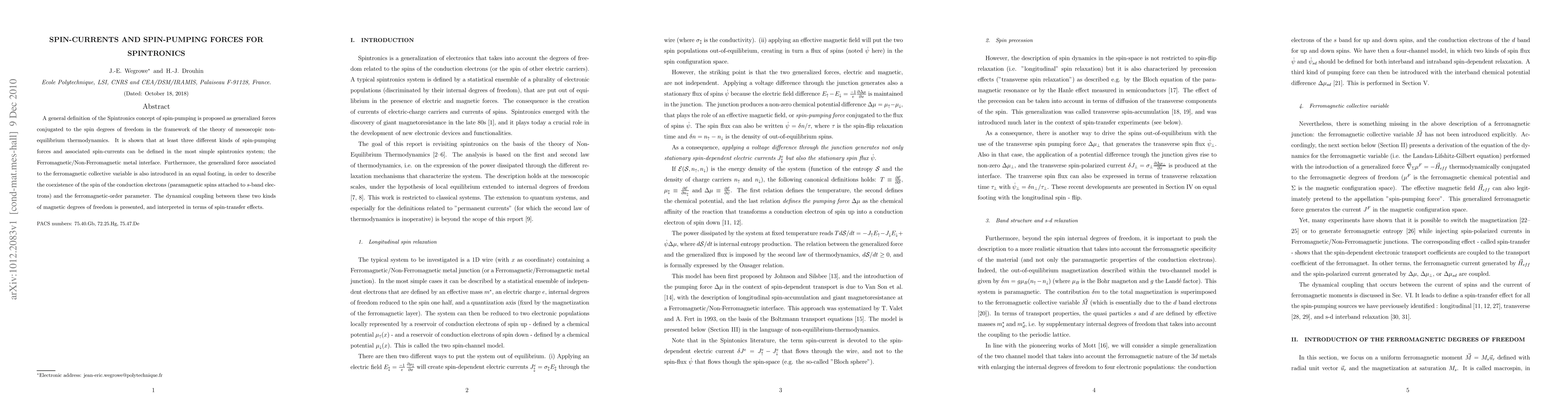 A general definition of the Spintronics concept of spin-pumping is proposed as generalized forces conjugated to the spin degrees of freedom in the framework of the theory of mesoscopic non-equilibrium thermodynamics. It is shown that at least three different kinds of spin-pumping forces and associated spin-currents can be defined in the most simple spintronics system (the Ferromagnetic/Non-Ferromagnetic metal interface). Furthermore, the generalized force associated to the ferromagnetic collective variable is also introduced in an equal footing, in order to describe the coexistence of the spin of the conduction electrons (paramagnetic spins attached to $s$-band electrons) and the ferromagnetic-order parameter. The dynamical coupling between these two kinds of magnetic degrees of freedom is presented, and interpreted in terms of spin-transfer effects.