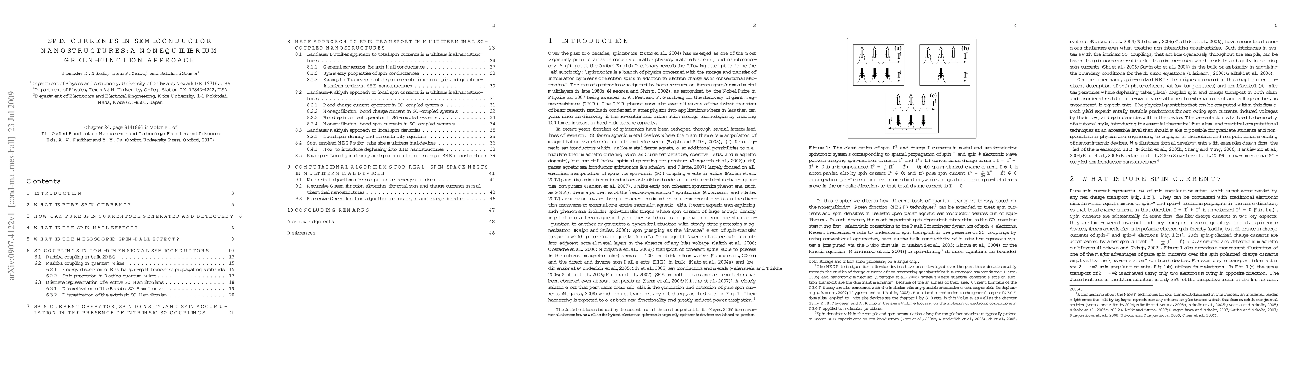 This chapter of "The Oxford Handbook of Nanoscience and Technology: Frontiers and Advances" reviews nonequilibrium Green function (NEGF) approach to modeling spin current generation, transport, and detection in semiconductor nanostructures containing different types of spin-orbit (SO) couplings. Its tutorial style--with examples drawn from the field of the spin Hall effects (SHEs) and with treatment of the Rashba, Dresselhaus and extrinsic SO couplings--offers practical recipes to compute total spin and charge currents flowing out of the device, as well as the nonequilibrium local spin densities and spin fluxes within the multiterminal nanostructure. These quantities, which are obtained from the knowledge of spin-resolved NEGFs that can describe both ballistic and diffusive transport regimes while handling phase-coherent effects or dephasing mechanisms relevant at room temperature, can be employed to understand recent experiments on all-electrical detection of mesoscopic and quantum SHE in complicated low-dimensional nanostructures, as well as to model a multitude of "second generation" spintronic devices exploiting coherent spin dynamics. The chapter also provides extensive coverage of relevant technical and computational details, such as: (i) the construction of retarded and lesser Green functions for SO-coupled nanostructures attached to many electrodes; (ii) computation of self-energies introduced by different types of electrodes attached to the central region; and (iii) accelerated algorithms for NEGF evaluation that make possible spin transport modeling in devices of the size comparable to the spin precession length (typically few hundreds of nanometers) that sets the scale where mesoscopic SHE effect in ballistic SO-coupled nanostructures is expected to reach its optimal magnitude.