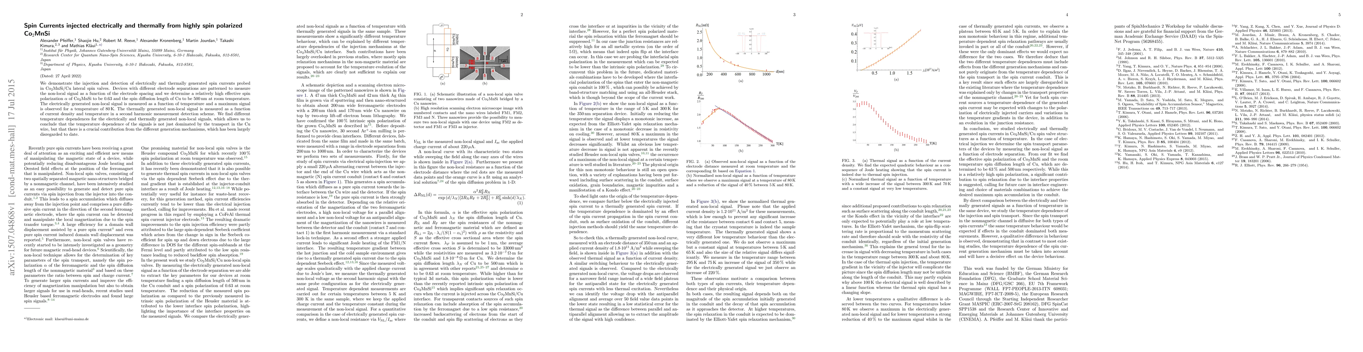 We demonstrate the injection and detection of electrically and thermally generated spin currents probed in Co$_2$MnSi/Cu lateral spin valves. Devices with different electrode separations are patterned to measure the non-local signal as a function of the electrode spacing and we determine a relatively high effective spin polarization $\alpha$ of Co$_2$MnSi to be 0.63 and the spin diffusion length of Cu to be 500 nm at room temperature. The electrically generated non-local signal is measured as a function of temperature and a maximum signal is observed for a temperature of 80 K. The thermally generated non-local signal is measured as a function of current density and temperature in a second harmonic measurement detection scheme. We find different temperature dependences for the electrically and thermally generated non-local signals, which allows us to conclude that the temperature dependence of the signals is not just dominated by the transport in the Cu wire, but that there is a crucial contribution from the different generation mechanisms, which has been largely disregarded to date.