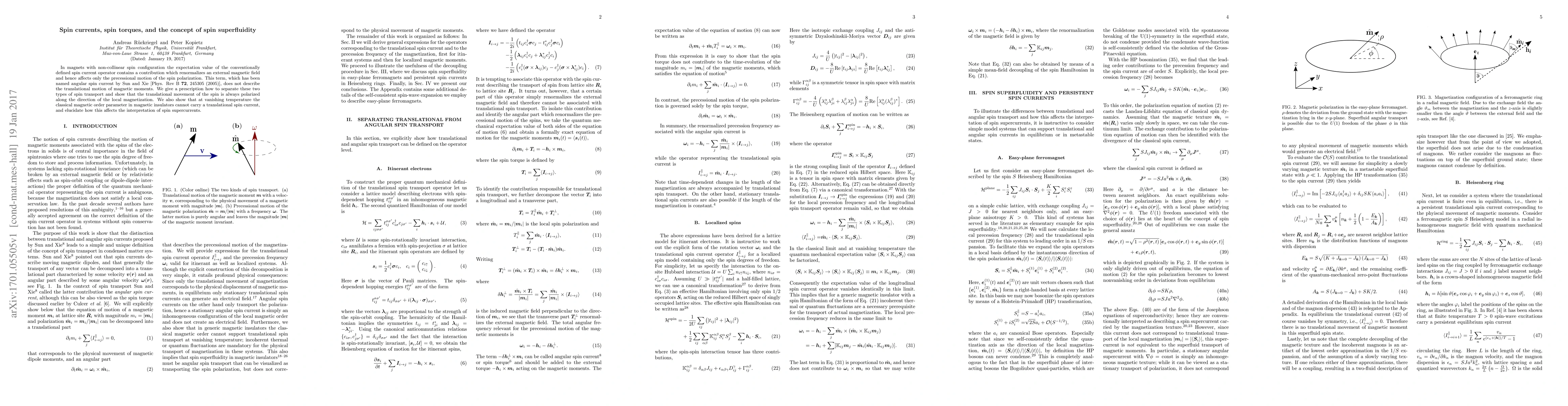 In magnets with non-collinear spin configuration the expectation value of the conventionally defined spin current operator contains a contribution which renormalizes an external magnetic field and hence affects only the precessional motion of the spin polarization. This term, which has been named angular spin current by Sun and Xie [Phys. Rev B 72, 245305 (2005)], does not describe the translational motion of magnetic moments. We give a prescription how to separate these two types of spin transport and show that the translational movement of the spin is always polarized along the direction of the local magnetization. We also show that at vanishing temperature the classical magnetic order parameter in magnetic insulators cannot carry a translational spin current, and elucidate how this affects the interpretation of spin supercurrents.