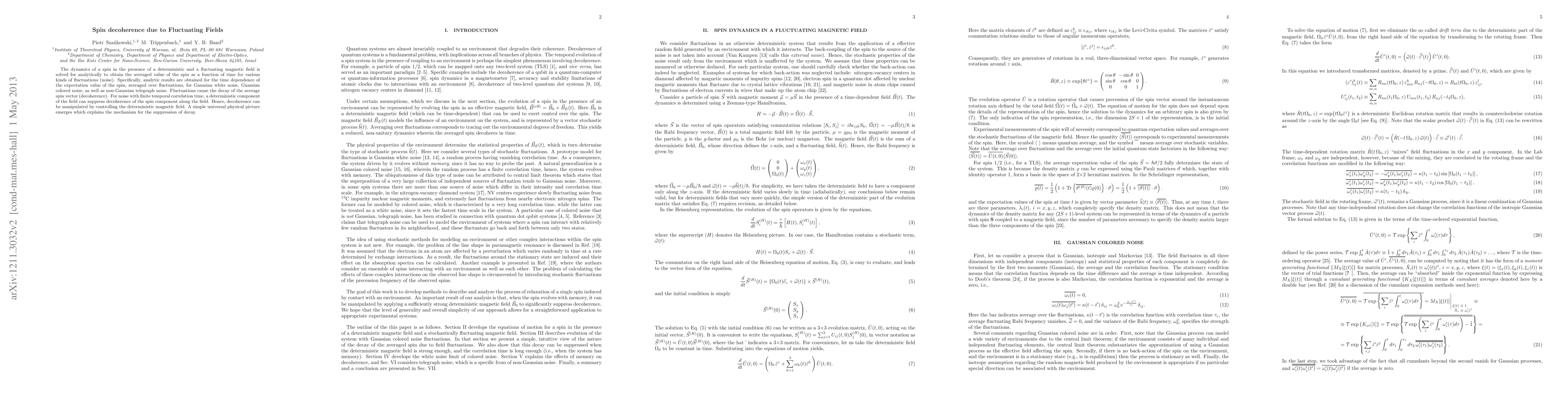 This paper analytically investigates spin decoherence in fluctuating magnetic fields, deriving the time-averaged spin expectation value under Gaussian white and colored noise, as well as non-Gaussian telegraph noise. It finds that fluctuations lead to spin decay (decoherence), but a deterministic field component can suppress decoherence, offering a universal mechanism for controlling spin decoherence.