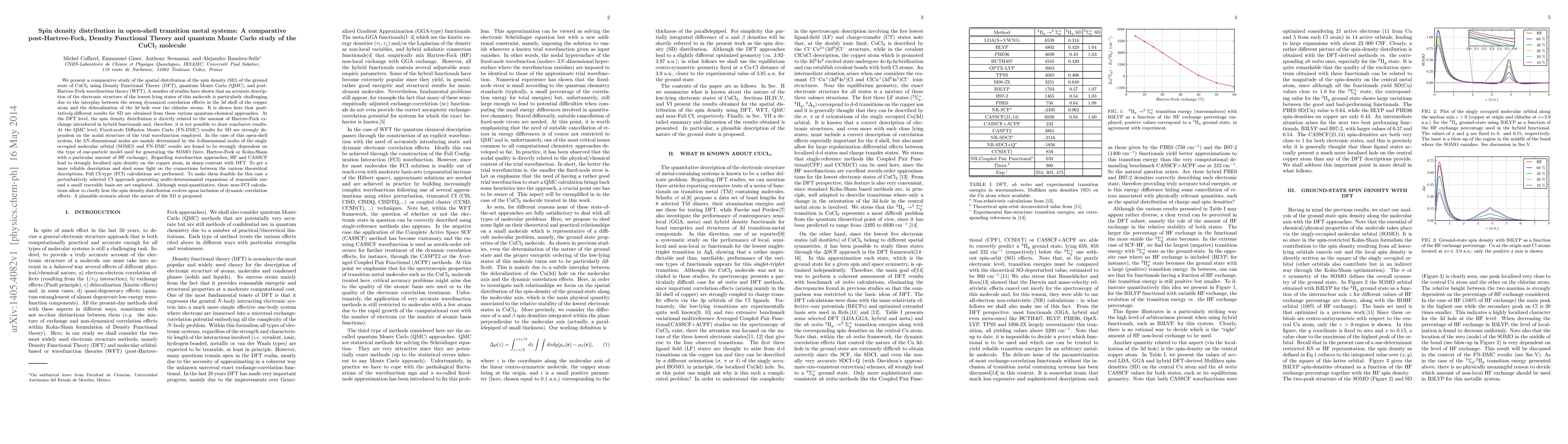 This paper compares spin density distributions in CuCl₂ using DFT, QMC, and post-Hartree-Fock methods, revealing significant differences in results due to the interplay of strong correlation effects in the copper atom's 3d shell and the delocalization over chlorine atoms. Near-FCI calculations provide insights into the evolution of spin density with dynamic correlation inclusion.