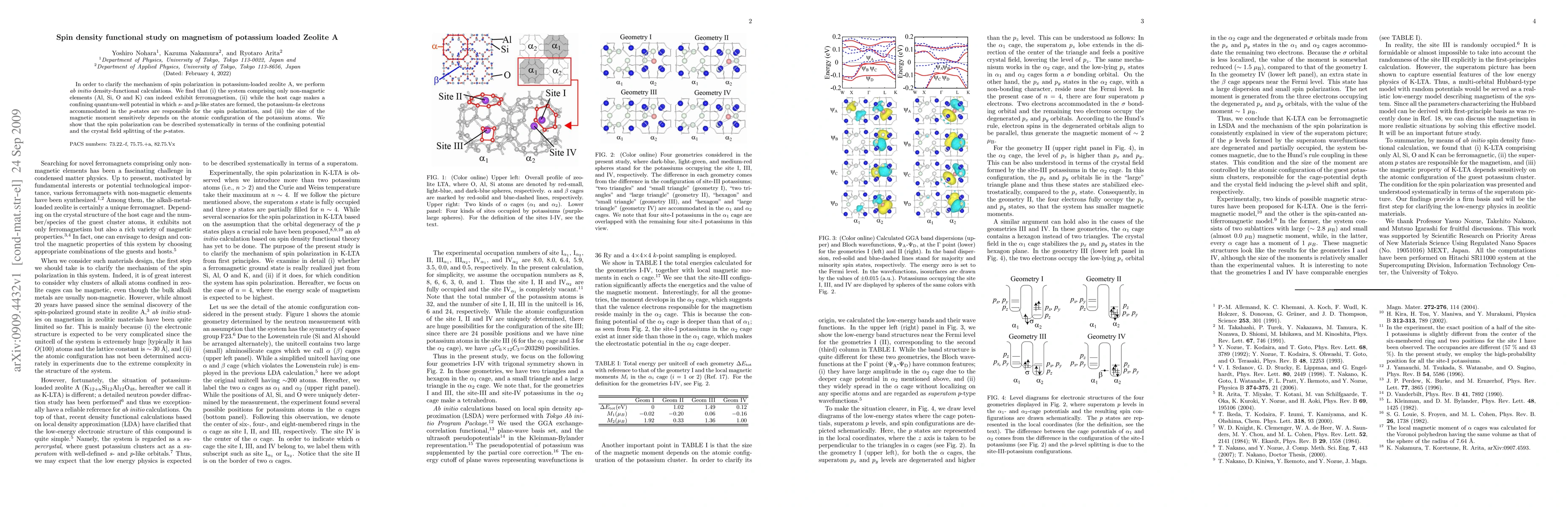This study uses density-functional calculations to investigate the magnetism in potassium-loaded zeolite A, revealing that the system can exhibit ferromagnetism due to spin polarization from potassium-4s electrons in p-states, with the magnetic moment size dependent on potassium atomic configuration. The findings suggest a systematic description of spin polarization through the confining potential and crystal field splitting.