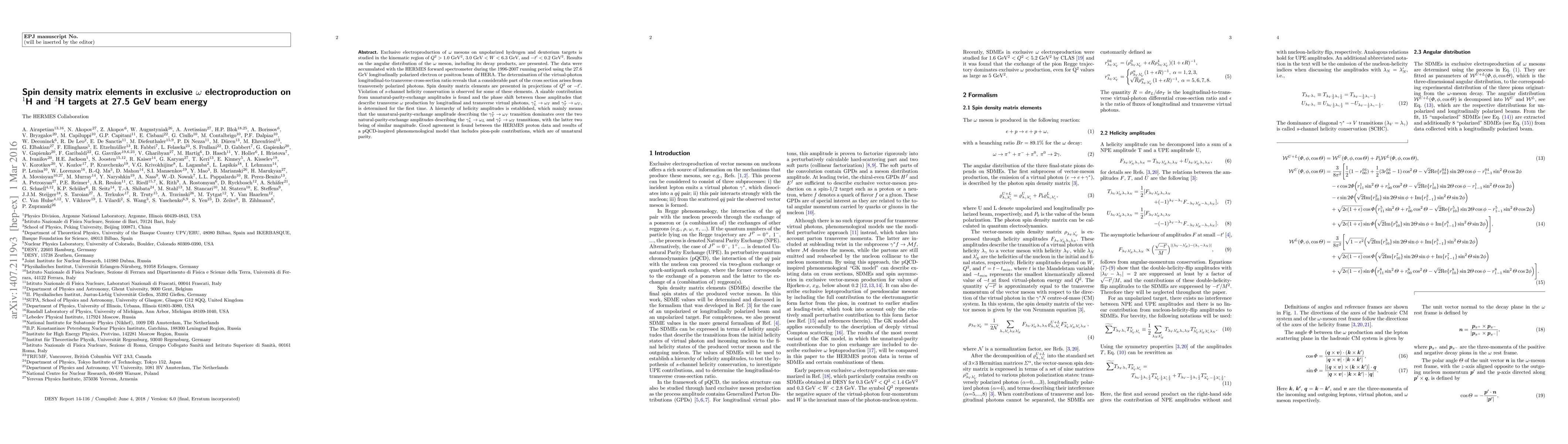 Exclusive electroproduction of $\omega$ mesons on unpolarized hydrogen and deuterium targets is studied in the kinematic region of Q$^2$>1.0 GeV$^2$, 3.0 GeV < W < 6.3 GeV, and -t'< 0.2 GeV$^2$. Results on the angular distribution of the $\omega$ meson, including its decay products, are presented. The data were accumulated with the HERMES forward spectrometer during the 1996-2007 running period using the 27.6 GeV longitudinally polarized electron or positron beam of HERA. The determination of the virtual-photon longitudinal-to-transverse cross-section ratio reveals that a considerable part of the cross section arises from transversely polarized photons. Spin density matrix elements are presented in projections of Q$^2$ or -t'. Violation of s-channel helicity conservation is observed for some of these elements. A sizable contribution from unnatural-parity-exchange amplitudes is found and the phase shift between those amplitudes that describe transverse $\omega$ production by longitudinal and transverse virtual photons, $\gamma^{*}_{L} \to \omega_{T}$ and $\gamma^{*}_{T} \to \omega_{T}$, is determined for the first time. A hierarchy of helicity amplitudes is established, which mainly means that the unnatural-parity-exchange amplitude describing the $\gamma^*_T \to \omega_T$ transition dominates over the two natural-parity-exchange amplitudes describing the $\gamma^*_L \to \omega_L$ and $\gamma^*_T \to \omega_T$ transitions, with the latter two being of similar magnitude. Good agreement is found between the HERMES proton data and results of a pQCD-inspired phenomenological model that includes pion-pole contributions, which are of unnatural parity.