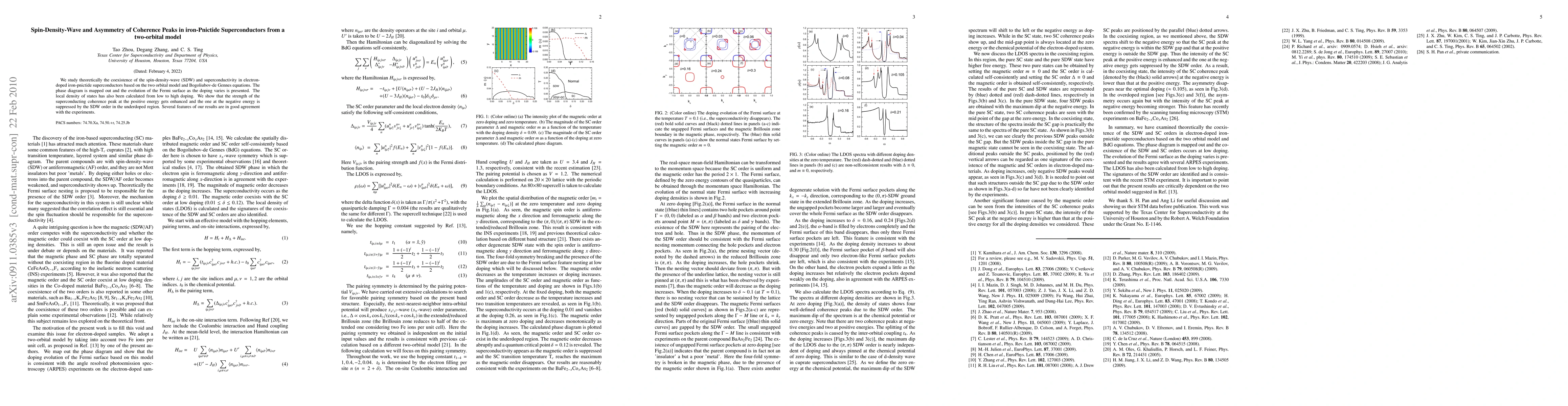 This paper theoretically investigates the interplay between spin-density-wave and superconductivity in electron-doped iron-pnictide superconductors using a two-orbital model. The study reveals that the spin-density-wave order enhances the positive energy coherent peak while suppressing the negative energy peak in the local density of states, aligning well with experimental observations.