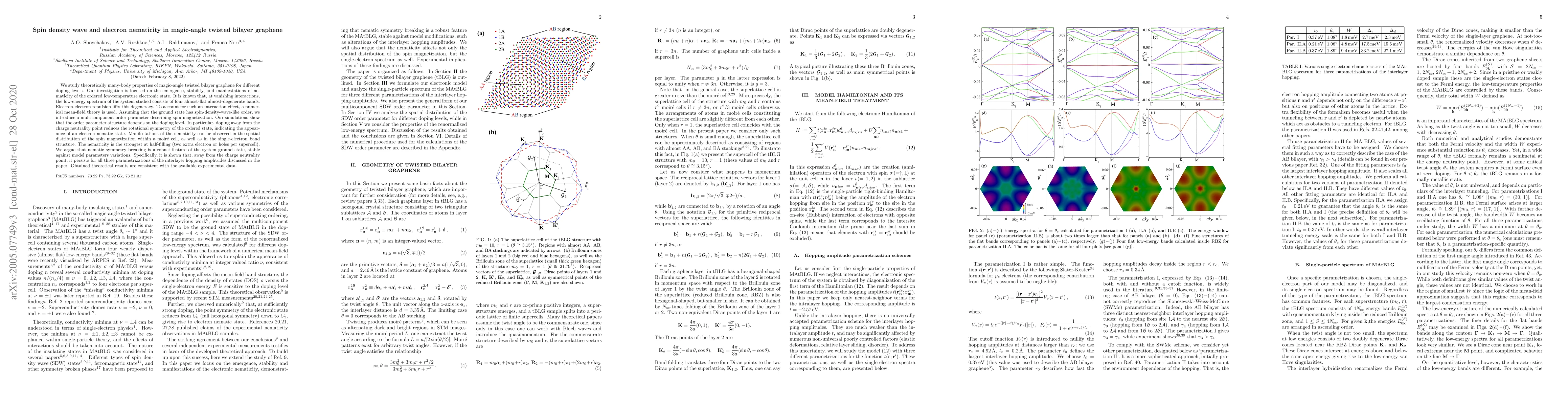 This research investigates the many-body properties of magic-angle twisted bilayer graphene, focusing on the emergence of spin density wave and electron nematicity. Theoretical simulations reveal that nematicity, characterized by reduced rotational symmetry, appears with doping away from charge neutrality, and is most pronounced at half-filling, supported by consistent experimental data.