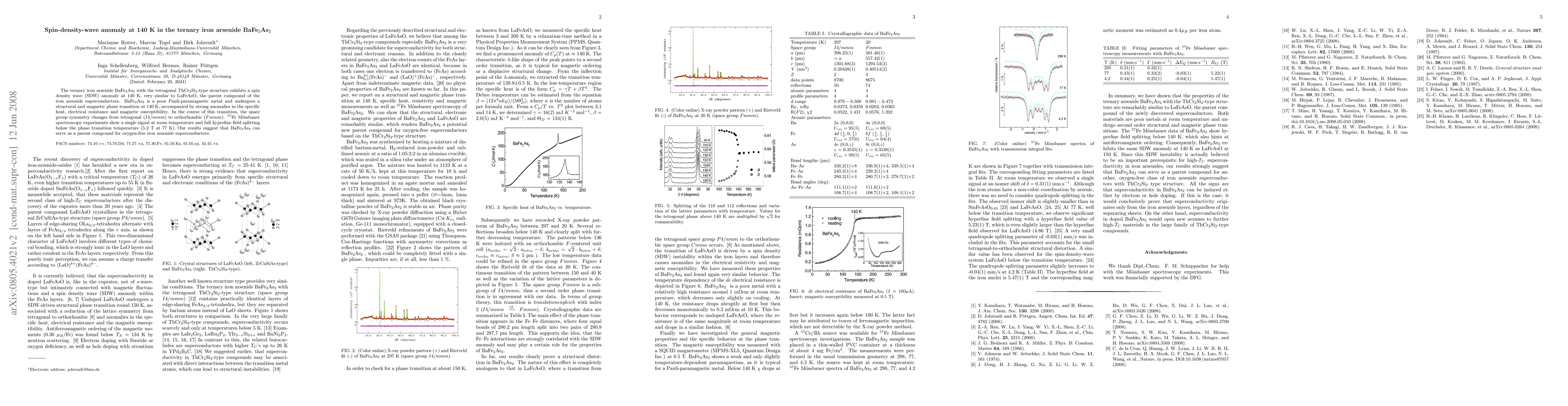 The ternary iron arsenide BaFe2As2 exhibits a spin density wave anomaly at 140 K, accompanied by structural and magnetic phase transitions, suggesting potential as a parent compound for oxygen-free iron arsenide superconductors. 57Fe Moessbauer spectroscopy reveals hyperfine field splitting indicative of this transition.