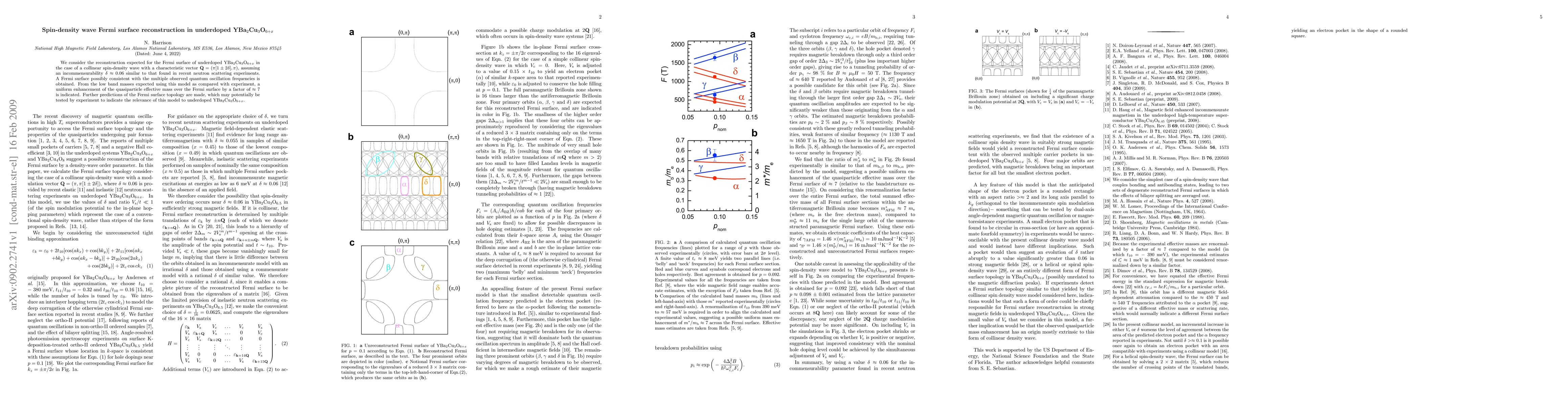 This study explores the Fermi surface reconstruction in underdoped YBa2Cu3O6+x due to a collinear spin-density wave, revealing a model consistent with observed quantum oscillation frequencies and suggesting a quasiparticle effective mass enhancement by a factor of ~7. Predictions about the Fermi surface topology are proposed for experimental validation.