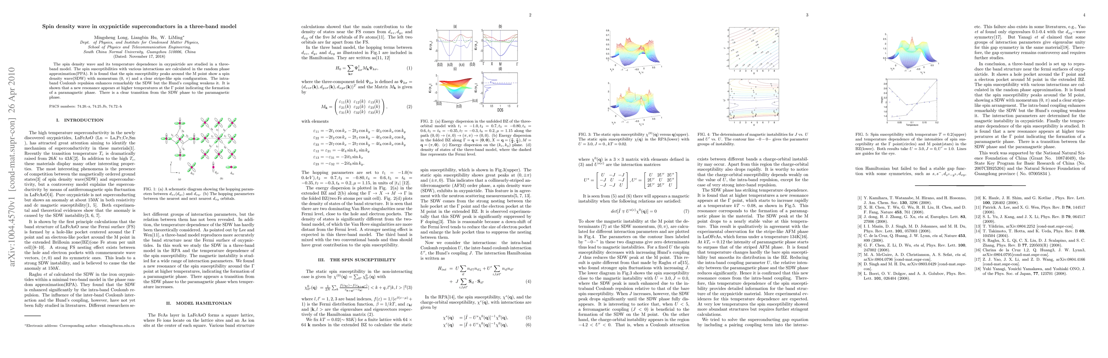 The spin density wave and its temperature dependence in oxypnictide are studied in a three-band model. The spin susceptibilities with various interactions are calculated in the random phase approximation(PPA). It is found that the spin susceptibility peaks around the M point show a spin density wave(SDW) with momentum (0, $\pi$) and a clear stripe-like spin configuration. The intra-band Coulomb repulsion enhances remarkably the SDW but the Hund's coupling weakens it. It is shown that a new resonance appears at higher temperatures at the $\Gamma$ point indicating the formation of a paramagnetic phase. There is a clear transition from the SDW phase to the paramagnetic phase.