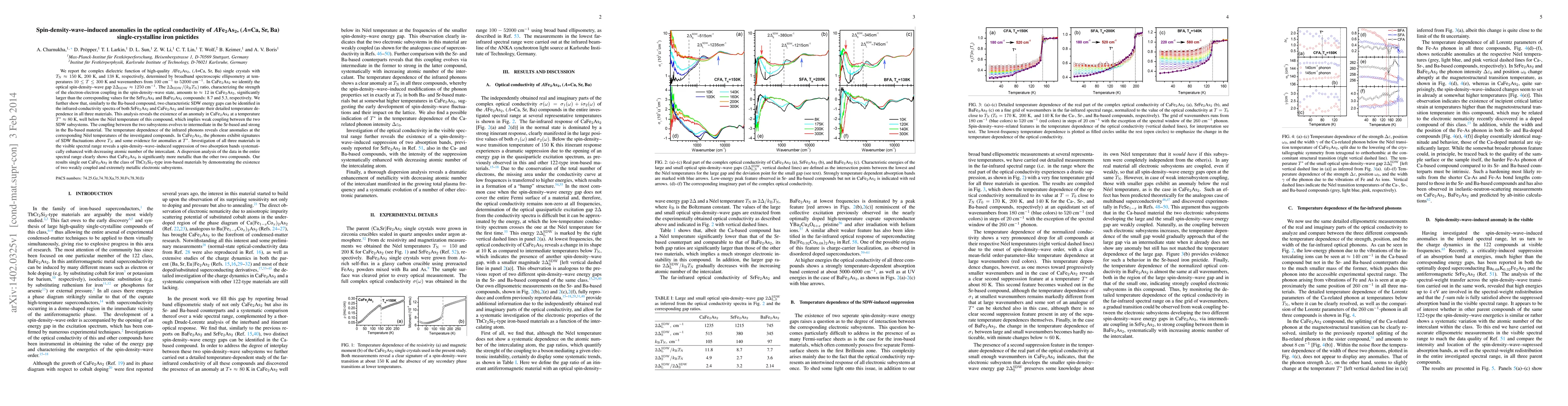 This study investigates the optical conductivity of single-crystalline $A\textrm{Fe}_2\textrm{As}_2$ (where $A$ = Ca, Sr, Ba) using spectroscopic ellipsometry, revealing spin-density-wave (SDW) anomalies and identifying distinct SDW energy gaps in the infrared spectra. Anomalies in $\textrm{CaFe}_2\textrm{As}_2$ suggest weak coupling between SDW subsystems, contrasting with stronger coupling in Sr and Ba-based compounds.
