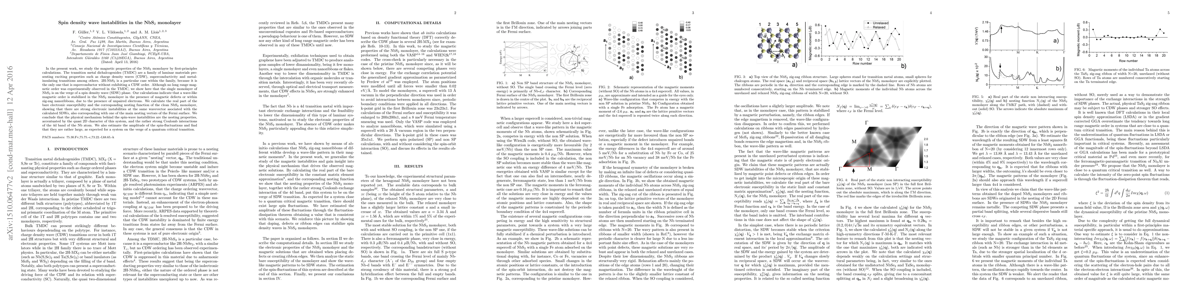 In the present work, we study the magnetic properties of the NbS2 monolayer by first-principles calculations. The transition metal dichalcogenides (TMDC) are a family of laminar materials presenting exciting properties such as charge density waves (CDW), superconductivity and metal-insulating transitions among others. 2H-NbS2 is a particular case within the family, because it is the only one that is superconductor without exhibiting a CDW order. Although no long range magnetic order was experimentally observed in the TMDC, we show here that the single monolayer of NbS2 is on the verge of a spin density wave (SDW) phase. Our calculations indicate that a wave-like magnetic order is stabilized in the NbS2 monolayer in the presence of magnetic defects or within zig-zag nanoribbons, due to the presence of unpaired electrons. We calculate the real part of the bare electronic susceptibilty and the corresponding nesting function of the clean NbS2 monolayer, showing that there are strong electronic instabilities at the same wavevector asociated with the calculated SDWs, also corresponding with one of the main nesting vectors of the Fermi surface. We conclude that the physical mechanism behind the spin-wave instabilities are the nesting properties, accentuated by the quasi 2D character of this system, and the rather strong Coulomb interactions of the 4d band of the Nb atom. We also estimate the amplitude of the spin-fluctuations and find that they are rather large, as expected for a system on the verge of a quantum critical transition.