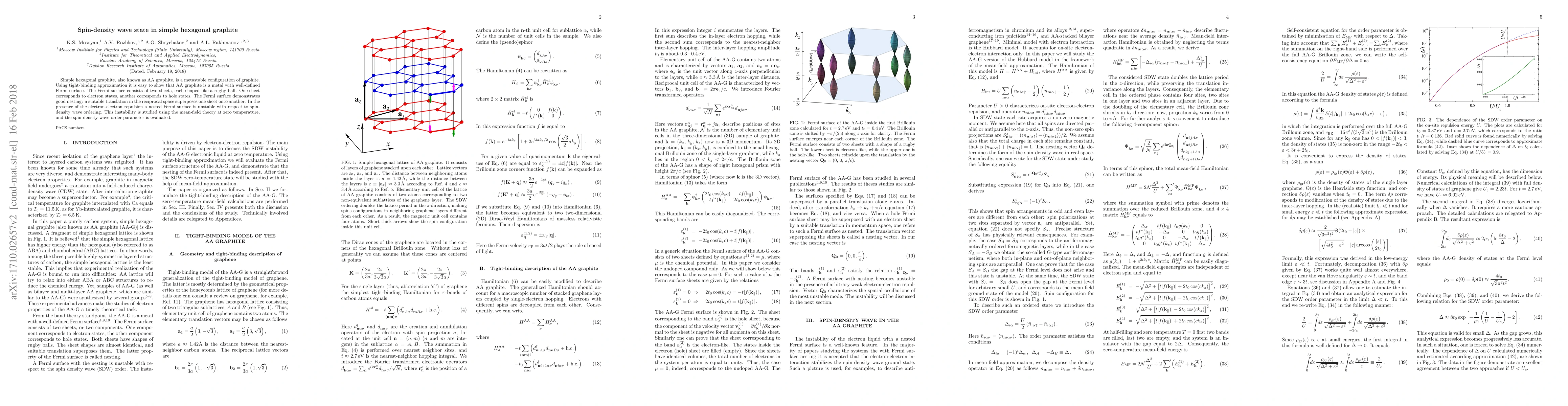 Simple hexagonal graphite, also known as AA graphite, is a metastable configuration of graphite. Using tight-binding approximation it is easy to demonstrate that AA graphite is a metal with well-defined Fermi surface. The Fermi surface consists of two sheets, each shaped like a rugby ball. One sheet corresponds to electron states, another corresponds to hole states. The Fermi surface demonstrates good nesting: a suitable translation in the reciprocal space superposes one sheet onto another. In the presence of the electron-electron repulsion a nested Fermi surface is unstable with respect to spin-density wave ordering. This instability is studied using the mean-field theory at zero temperature, and the spin-density wave order parameter is evaluated.