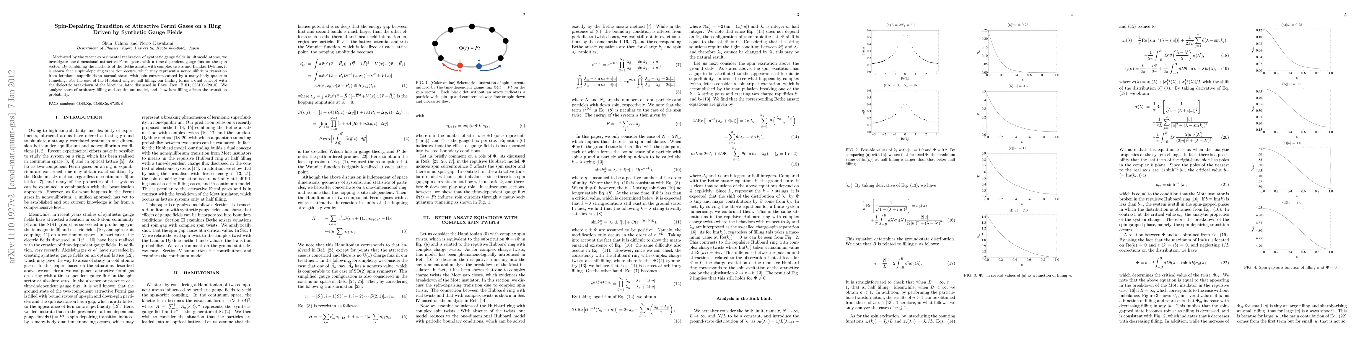 Motivated by the recent experimental realization of synthetic gauge fields in ultracold atoms, we investigate one-dimensional attractive Fermi gases with a time-dependent gauge flux on the spin sector. By combining the methods of the Bethe ansatz with complex twists and Landau-Dykhne, it is shown that a spin-depairing transition occurs, which may represent a nonequilibrium transition from fermionic superfluids to normal states with spin currents caused by a many-body quantum tunneling. For the case of the Hubbard ring at half filling, our finding forms a dual concept with the dielectric breakdown of the Mott insulator discussed in Phys. Rev. B 81, 033103 (2010). We analyze cases of arbitrary filling and continuum model, and show how the filling affects the transition probability.