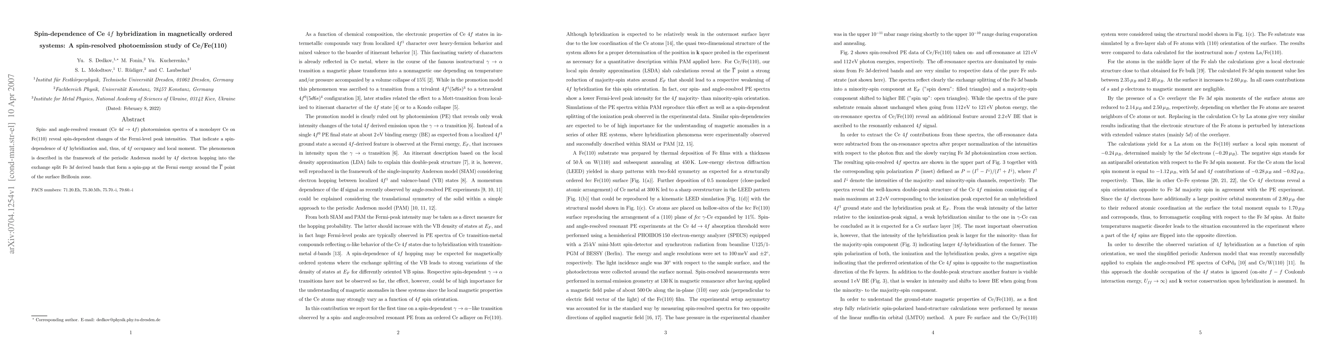 This study uses spin- and angle-resolved photoemission to show that the hybridization of Ce $4f$ electrons in Ce/Fe(110) systems is spin-dependent, affecting the $4f$ occupancy and local moment. The findings are explained by $4f$ electron hopping into the exchange split Fe 3d bands, creating a spin-gap at the Fermi level.