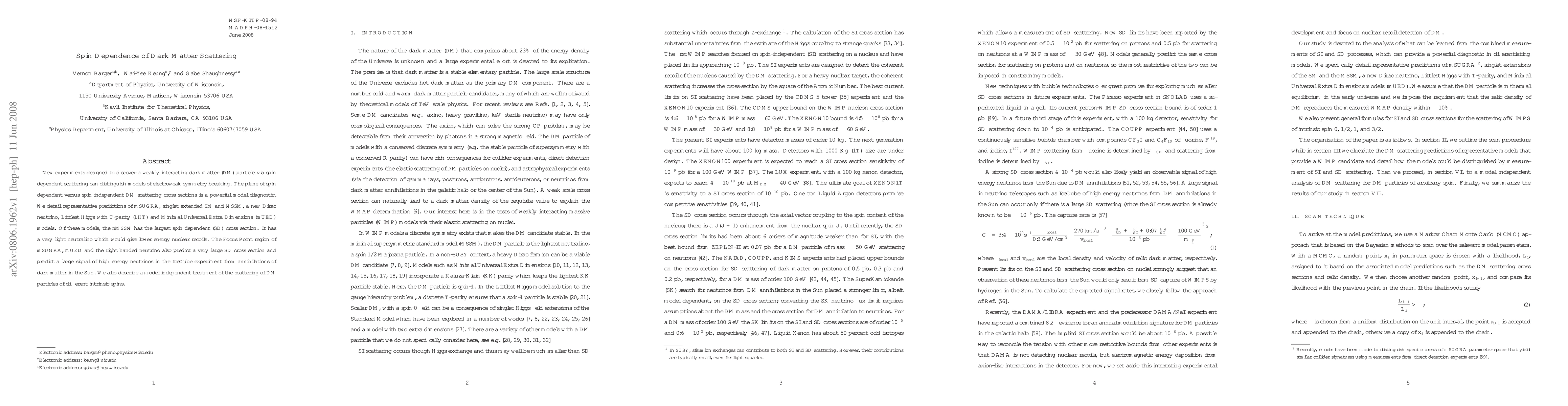 New experiments designed to discover a weakly interacting dark matter (DM) particle via spin dependent scattering can distinguish models of electroweak symmetry breaking. The plane of spin dependent versus spin independent DM scattering cross sections is a powerful model diagnostic. We detail representative predictions of mSUGRA, singlet extended SM and MSSM, a new Dirac neutrino, Littlest Higgs with T-parity (LHT) and Minimal Universal Extra Dimensions (mUED) models. Of these models, the nMSSM has the largest spin dependent (SD) cross section. It has a very light neutralino which would give lower energy nuclear recoils. The Focus Point region of mSUGRA, mUED and the right handed neutrino also predict a very large SD cross section and predict a large signal of high energy neutrinos in the IceCube experiment from annihilations of dark matter in the Sun. We also describe a model independent treatment of the scattering of DM particles of different intrinsic spins.