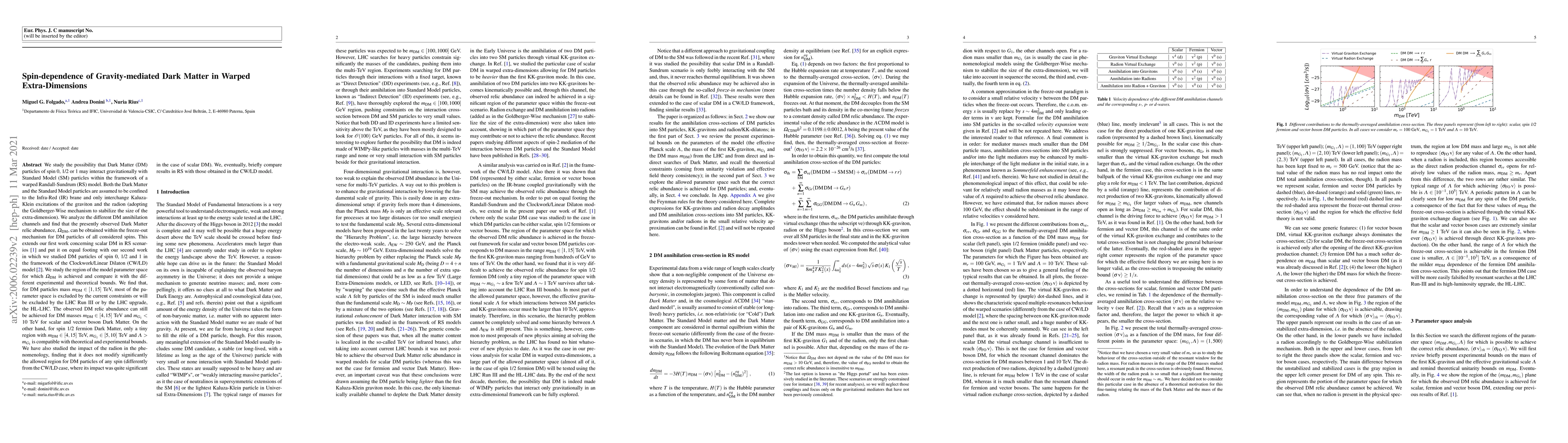We study the spin-dependence of Dark Matter (DM) particles which interact gravitationally with the Standard Model (SM) in an extra-dimensional Randall-Sundrum scenario. We assume that both the Dark Matter and the Standard Model are confined to the TeV (Infra-red) brane and only interact via gravitational mediators, namely Kaluza-Klein gravitons and the radion. We analyze the different DM annihilation channels and find that it is possible to achieve the presently observed relic abundance of Dark Matter, $\Omega_{\rm DM}$, within the freeze-out mechanism for DM particles of spin 0, 1/2 and 1. We study the region of the model parameter space for which $\Omega_{\rm DM}$ is achieved and compare it with the different experimental and theoretical bounds. We also consider the impact of the radion in the phenomenology. We find that, for DM particles mass $m_{\rm DM} \in [1,15]$ TeV, most of the parameter space is excluded by the current constraints or will be excluded by the LHC Run III or by the LHC upgrade, the HL-LHC. The presence of the radion does not modify significantly the non-excluded region. The observed DM relic abundance can still be achieved for DM masses $m_{\rm } \in [4,15]$ TeV and $m_{G_1} < 10$ TeV for scalar and vector boson Dark Matter. On the other hand, for spin 1/2 fermion Dark Matter, only a tiny region with $m_{\rm DM } \in [4, 15]$ TeV, $m_{G_1} \in [5,10]$ TeV and $\Lambda > m_{G_1}$ is compatible with theoretical and experimental bounds.
