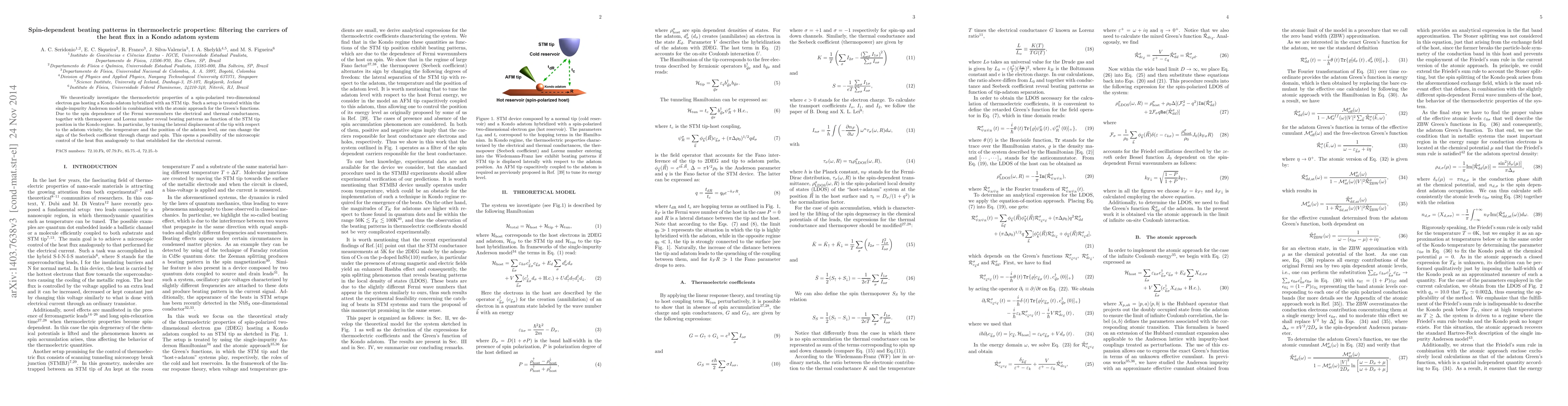 This paper explores the thermoelectric properties of a spin-polarized electron gas with a Kondo adatom, revealing spin-dependent beating patterns in electrical and thermal conductances. By adjusting the STM tip's position and the adatom's level, the Seebeck coefficient's sign can be altered, enabling microscopic control over heat flux.