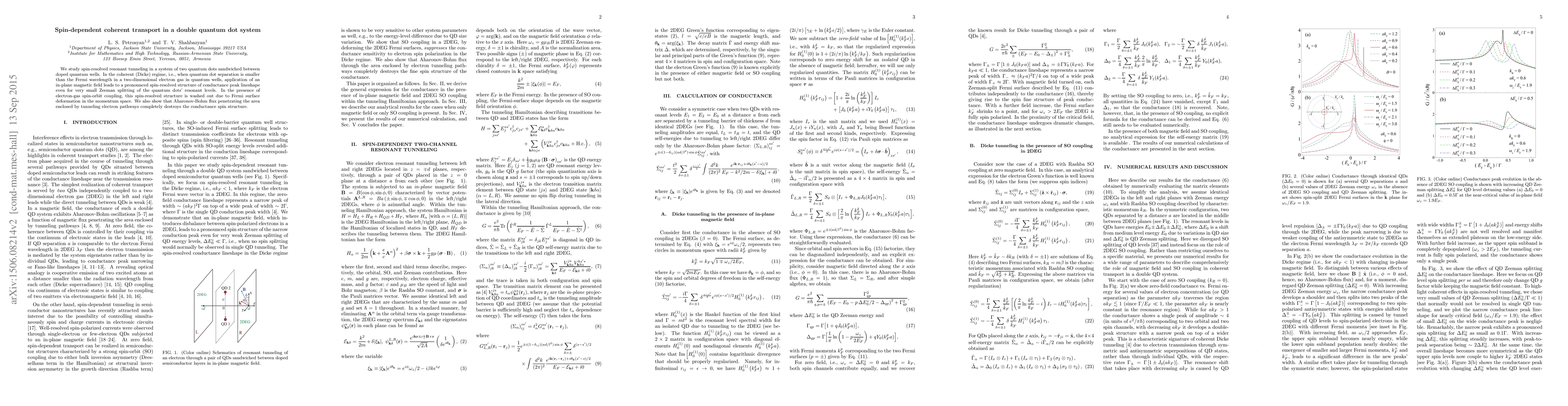 We study spin-resolved resonant tunneling in a system of two quantum dots sandwiched between doped quantum wells. In the coherent (Dicke) regime, i.e., when quantum dot separation is smaller than the Fermi wavelength in a two-dimensional electron gas in quantum wells, application of an in-plane magnetic field leads to a pronounced spin-resolved structure of the conductance peak lineshape even for very small Zeeman splitting of the quantum dots' resonant levels. In the presence of electron-gas spin-orbit coupling, this spin-resolved structure gets washed out due to Fermi surface deformation in the momentum space. We also show that Aharonov-Bohm flux penetrating the area enclosed by electron tunneling pathways completely destroys conductance spin structure.