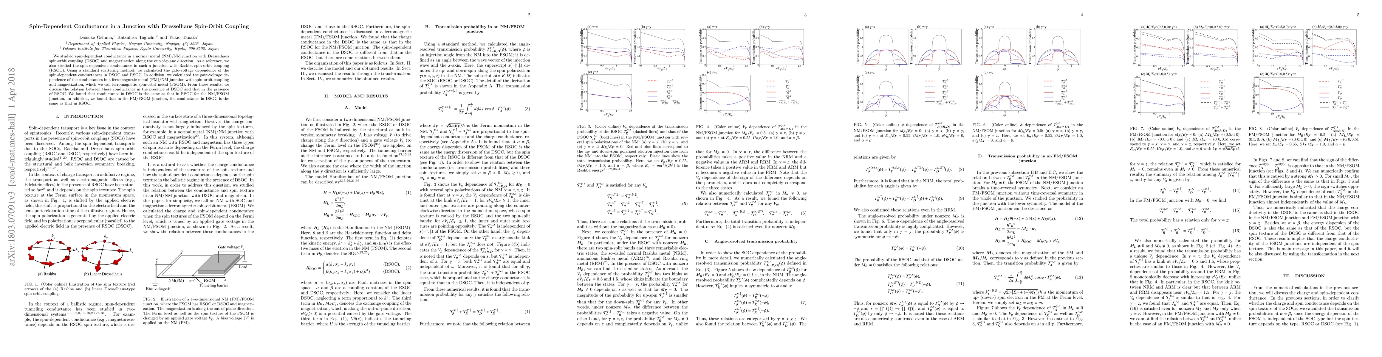 We studied spin-dependent conductance in a normal metal (NM)/NM junction with Dresselhaus spin-orbit coupling (DSOC) and magnetization. As a reference, we also studied the spin-dependent conductance in such a junction with Rashba spin-orbit coupling (RSOC). Using a standard scattering method, we calculated the gate-voltage dependence of the spin-dependent conductances in DSOC and RSOC. In addition, we calculated the gate-voltage dependence of the conductances in a ferromagnetic metal (FM)/NM junction with spin-orbit coupling and magnetization, which we call ferromagnetic spin-orbit metal (FSOM). From these results, we discuss the relation between these conductance in the presence of DSOC and that in the presence of RSOC. We found that conductance in DSOC is the same as that in RSOC for the NM/FSOM junction. In addition, we found that in the FM/FSOM junction, the conductance in DSOC is the same as that in RSOC only when the FM magnetization is along the out-of-plane direction.