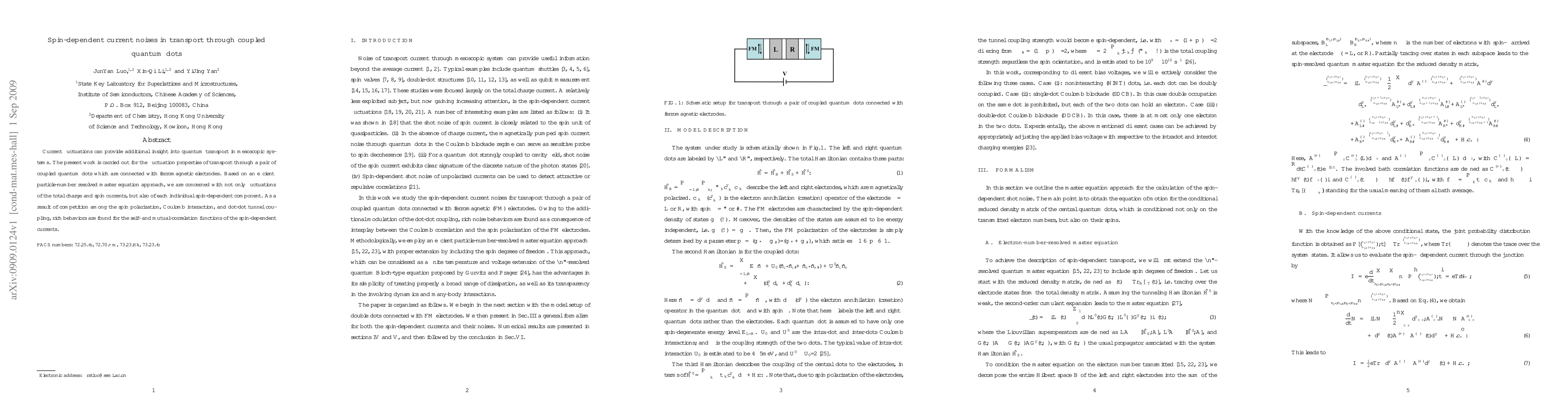 This study investigates current fluctuations in a system of coupled quantum dots connected to ferromagnetic electrodes, focusing on spin-dependent current noises. Using a particle-number-resolved master equation, it reveals complex behaviors in the self- and mutual-correlation functions of spin-dependent currents due to competing spin polarization, Coulomb interaction, and tunnel coupling.