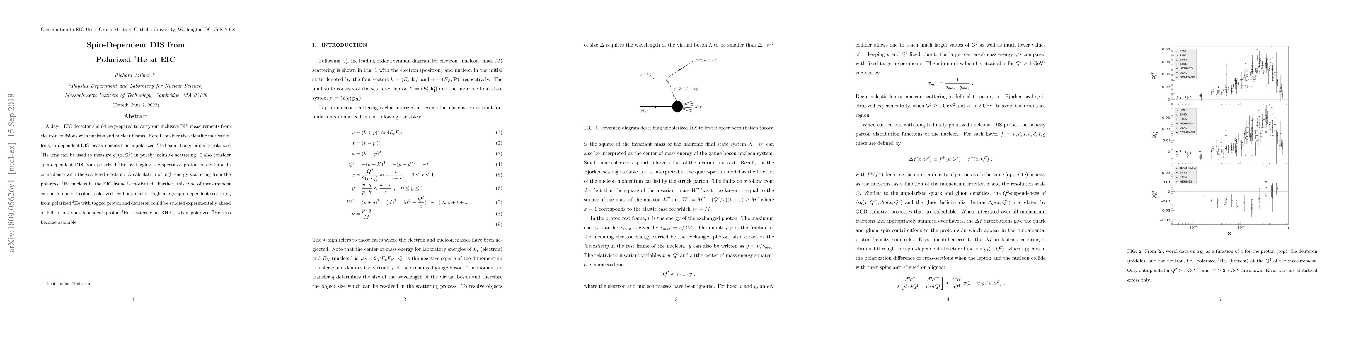 A day-1 EIC detector should be prepared to carry out inclusive DIS measurements from electron collisions with nucleon and nuclear beams. Here I consider the scientific motivation for spin-dependent DIS measurements from a polarized $^3$He beam. Longitudinally polarized $^3$He ions can be used to measure $g^n_1(x,Q^2)$ in purely inclusive scattering. I also consider spin-dependent DIS from polarized $^3$He by tagging the spectator proton or deuteron in coincidence with the scattered electron. A calculation of high energy scattering from the polarized $^3$He nucleus in the EIC frame is motivated. Further, this type of measurement can be extended to other polarized few-body nuclei. High energy spin-dependent scattering from polarized $^3$He with tagged proton and deuteron could be studied experimentally ahead of EIC using spin-dependent proton-$^3$He scattering in RHIC, when polarized $^3$He ions become available.
