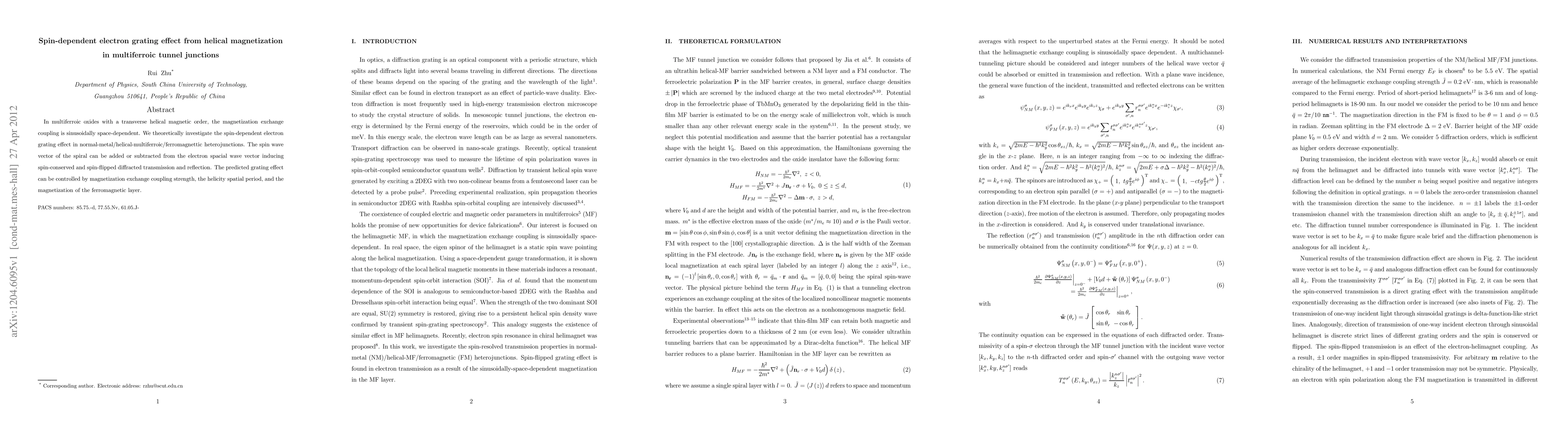 In multiferroic oxides with a transverse helical magnetic order, the magnetization exchange coupling is sinusoidally space-dependent. We theoretically investigate the spin-dependent electron grating effect in normal-metal/helical-multiferroic/ferromagnettic heterojunctions. The spin wave vector of the spiral can be added or subtracted from the electron spacial wave vector inducing spin-conserved and spin-flipped diffracted transmission and reflection. The predicted grating effect can be controlled by magnetization exchange coupling strength, the helicity spatial period, and the magnetization of the ferromagnetic layer.