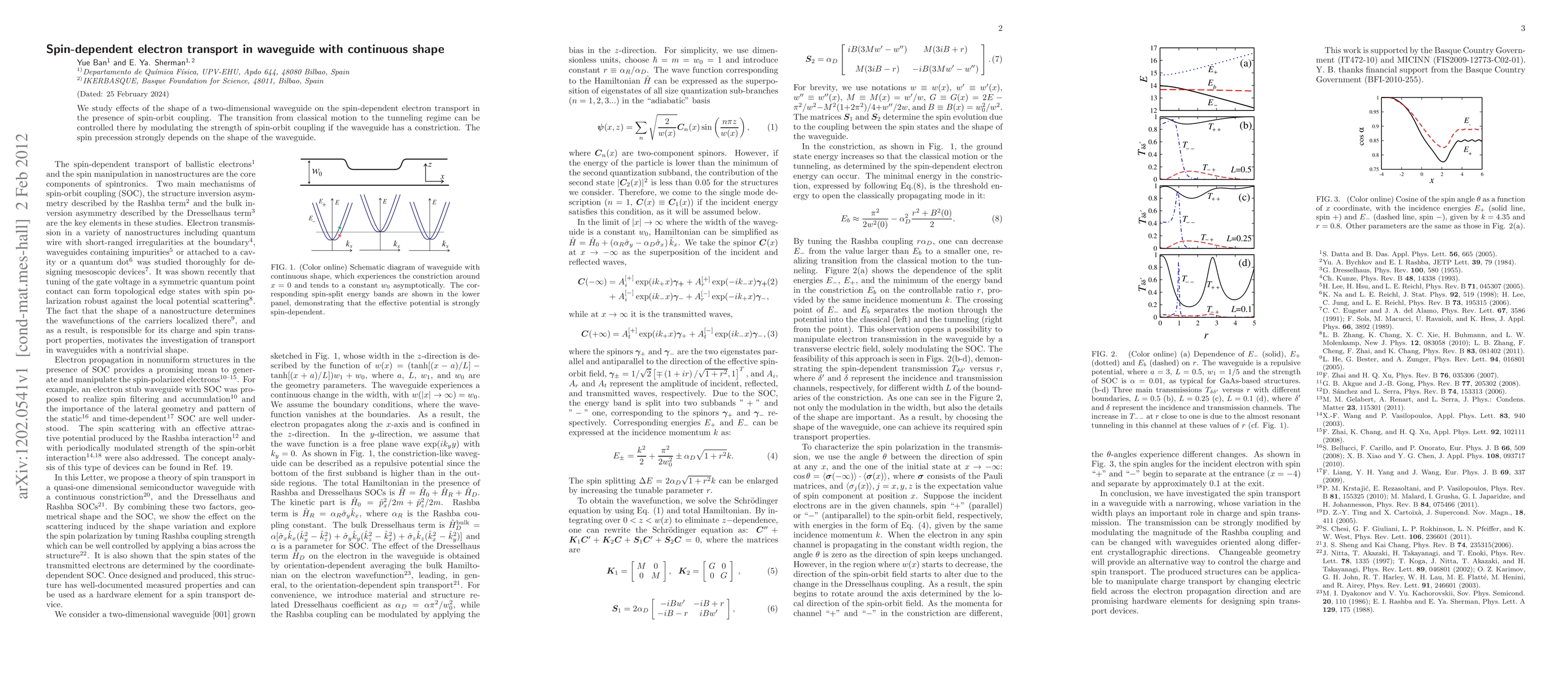 Researchers studied how shape affects spin-dependent electron transport in waveguides with varying levels of spin-orbit coupling. They found that changing the waveguide's constriction can control the transition to tunneling and influence spin precession.