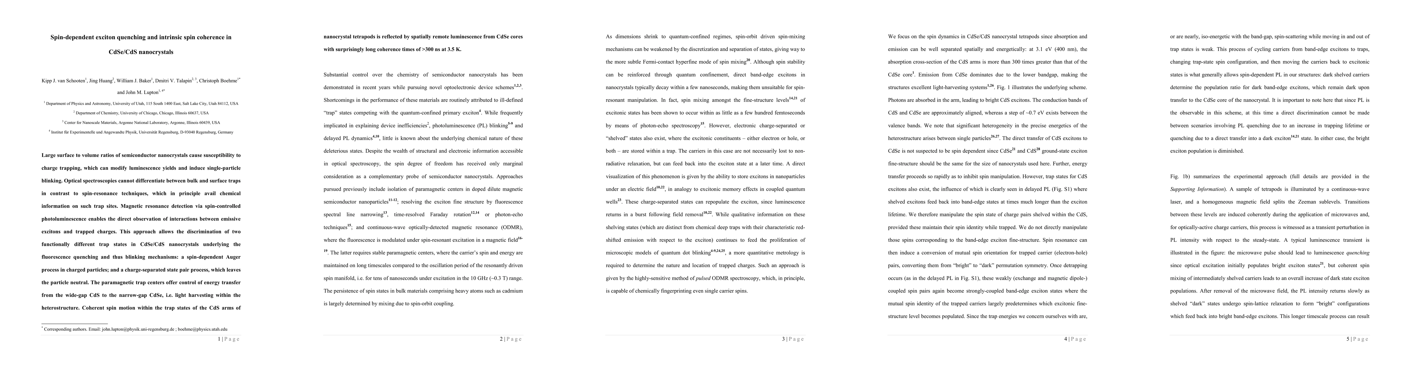 Large surface to volume ratios of semiconductor nanocrystals cause susceptibility to charge trapping, which can modify luminescence yields and induce single-particle blinking. Optical spectroscopies cannot differentiate between bulk and surface traps in contrast to spin-resonance techniques, which in principle avail chemical information on such trap sites. Magnetic resonance detection via spin-controlled photoluminescence enables the direct observation of interactions between emissive excitons and trapped charges. This approach allows the discrimination of two functionally different trap states in CdSe/CdS nanocrystals underlying the fluorescence quenching and thus blinking mechanisms: a spin-dependent Auger process in charged particles; and a charge-separated state pair process, which leaves the particle neutral. The paramagnetic trap centers offer control of energy transfer from the wide-gap CdS to the narrow-gap CdSe, i.e. light harvesting within the heterostructure. Coherent spin motion within the trap states of the CdS arms of nanocrystal tetrapods is reflected by spatially remote luminescence from CdSe cores with surprisingly long coherence times of >300 ns at 3.5 K.