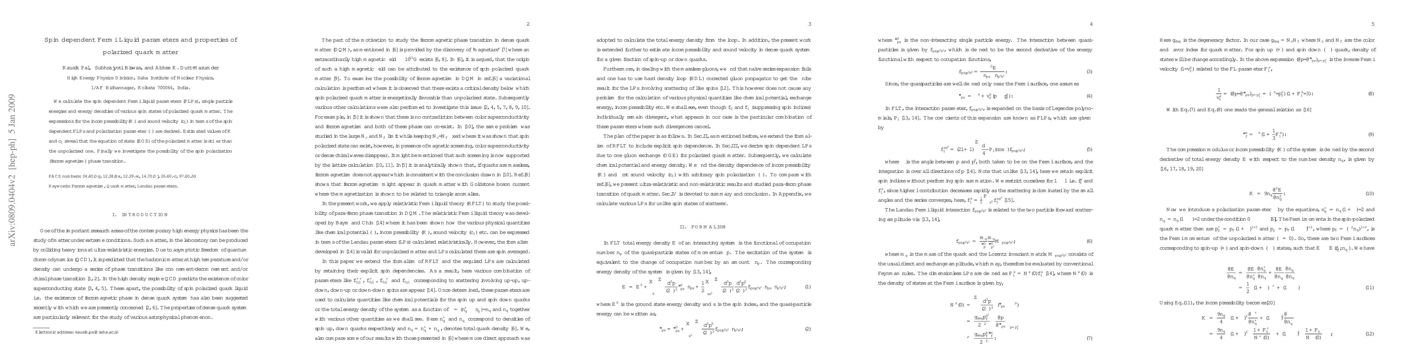 This paper calculates spin dependent Fermi liquid parameters for polarized quark matter, deriving expressions for incompressibility and sound velocity. Results show a stiffer equation of state for polarized matter, and the study explores the possibility of a spin polarization phase transition.