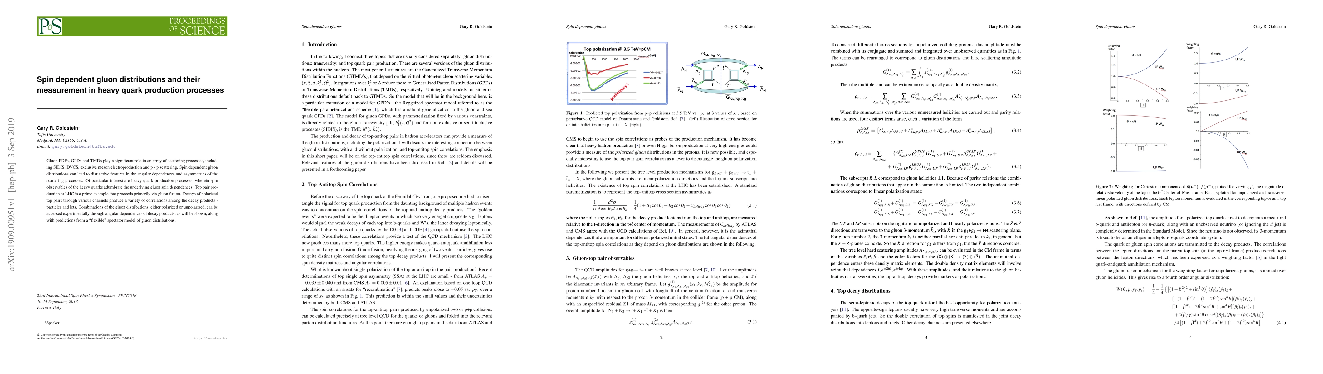 Gluon PDFs, GPDs and TMDs play a significant role in an array of scattering processes, including SIDIS, DVCS, exclusive meson electroproduction and p - p scattering. Spin dependent gluon distributions can lead to distinctive features in the angular dependences and asymmetries of the scattering processes. Of particular interest are heavy quark production processes, wherein spin observables of the heavy quarks adumbrate the underlying gluon spin dependences. Top pair production at LHC is a prime example that proceeds primarily via gluon fusion. Decays of polarized top pairs through various channels produce a variety of correlations among the decay products - particles and jets. Combinations of the gluon distributions, either polarized or unpolarized, can be accessed experimentally through angular dependences of decay products, as will be shown, along with predictions from a "flexible" spectator model of gluon distributions.
