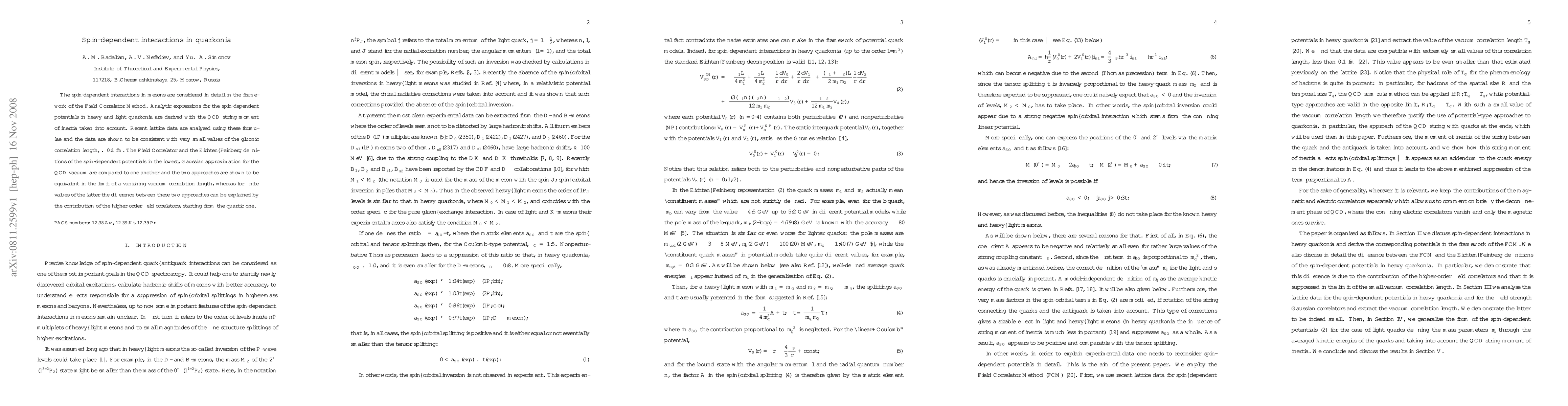 Researchers used a specific method to analyze spin-dependent interactions in quarkonia, finding that recent lattice data is consistent with very small gluonic correlation lengths, less than 0.1 fm. The study also compared two approaches to calculating these interactions and found they were equivalent when the vacuum correlation length was zero, but differed for finite values due to higher-order field correlators.