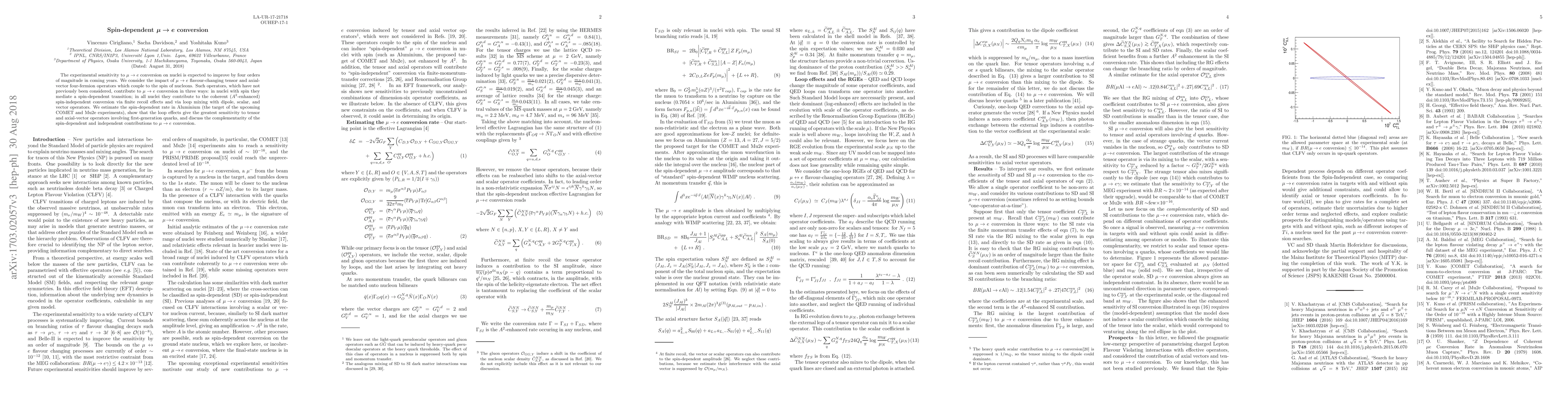 The experimental sensitivity to $\mu \to e$ conversion on nuclei is expected to improve by four orders of magnitude in coming years. We consider the impact of $\mu \to e$ flavour-changing tensor and axial-vector four-fermion operators which couple to the spin of nucleons. Such operators, which have not previously been considered, contribute to $\mu \to e$ conversion in three ways: in nuclei with spin they mediate a spin-dependent transition; in all nuclei they contribute to the coherent ($A^2$-enhanced) spin-independent conversion via finite recoil effects and via loop mixing with dipole, scalar, and vector operators. We estimate the spin-dependent rate in Aluminium (the target of the upcoming COMET and Mu2e experiments), show that the loop effects give the greatest sensitivity to tensor and axial-vector operators involving first-generation quarks, and discuss the complementarity of the spin-dependent and independent contributions to $\mu \to e$ conversion