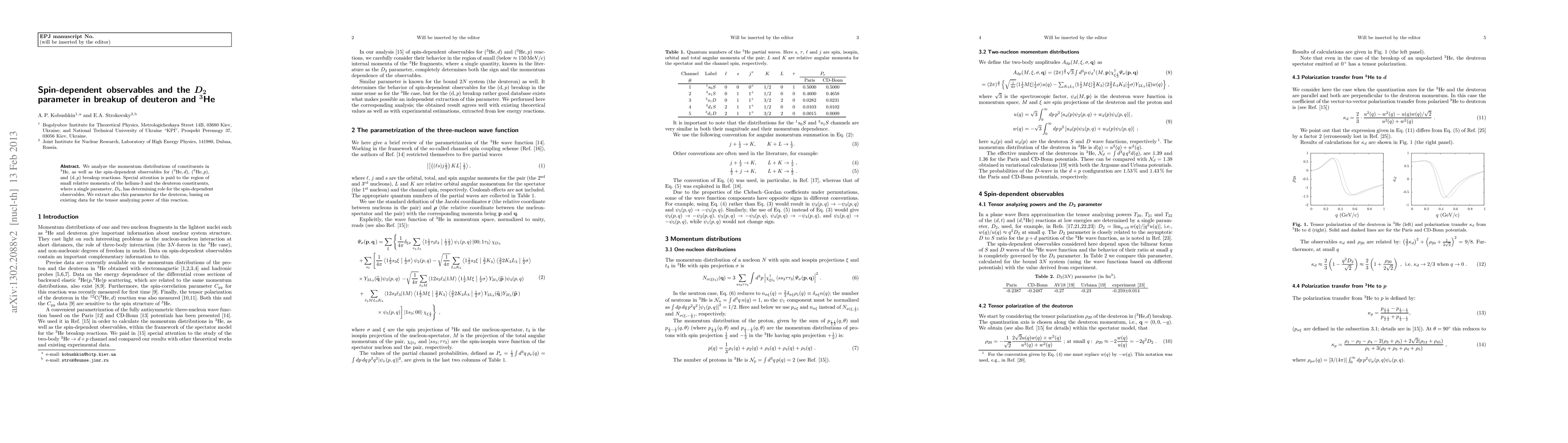 This paper investigates the momentum distributions and spin-dependent observables in (3He,d), (3He,p), and (d,p) breakup reactions, focusing on the role of the D_2 parameter in the region of small relative momenta. The study also determines the D_2 parameter for the deuteron using existing data on tensor analyzing power.