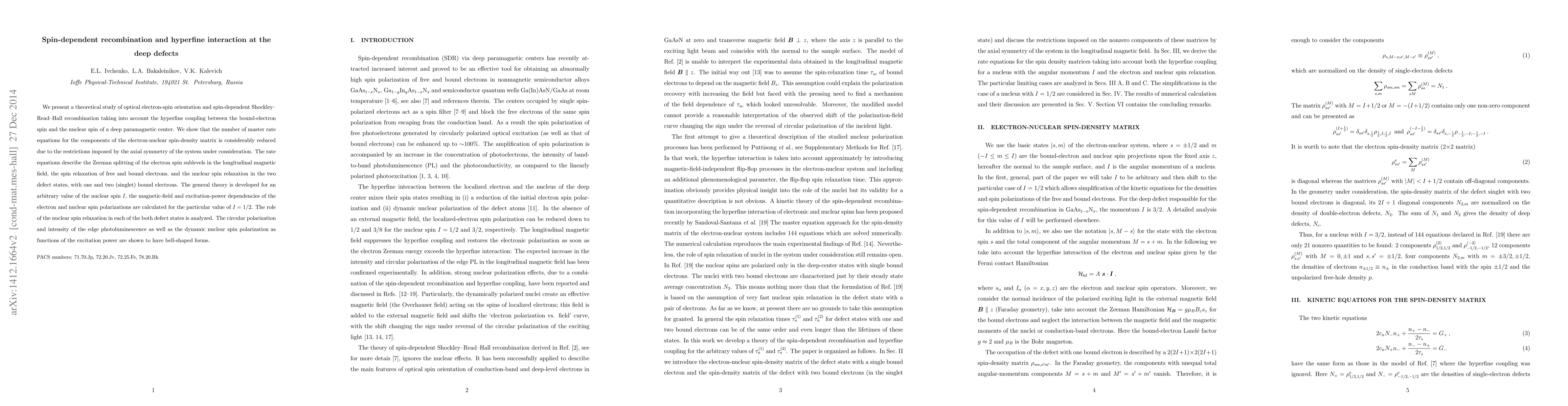 We present a theoretical study of optical electron-spin orientation and spin-dependent Shockley-Read-Hall recombination taking into account the hyperfine coupling between the bound-electron spin and the nuclear spin of a deep paramagnetic center. We show that the number of master rate equations for the components of the electron-nuclear spin-density matrix is considerably reduced due to the restrictions imposed by the axial symmetry of the system under consideration. The rate equations describe the Zeeman splitting of the electron spin sublevels in the longitudinal magnetic field, the spin relaxation of free and bound electrons, and the nuclear spin relaxation in the two defect states, with one and two (singlet) bound electrons. The general theory is developed for an arbitrary value of the nuclear spin I, the magnetic-field and excitation-power dependencies of the electron and nuclear spin polarizations are calculated for the particular value of I = 1/2. The role of the nuclear spin relaxation in each of the both defect states is analyzed. The circular polarization and intensity of the edge photoluminescence as well as the dynamic nuclear spin polarization as functions of the excitation power are shown to have bell-shaped forms