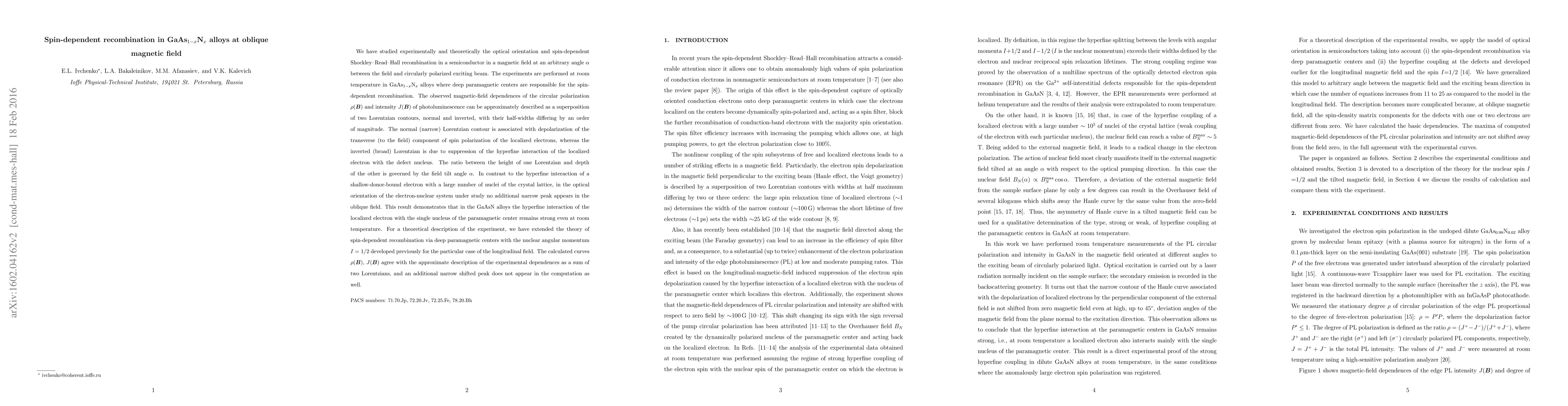 We have studied experimentally and theoretically the optical orientation and spin-dependent Shockley-Read-Hall recombination in a semiconductor in a magnetic field at an arbitrary angle between the field and circularly polarized exciting beam. The experiments are performed at room temperature in GaAsN alloys where deep paramagnetic centers are responsible for the spin-dependent recombination. The observed magnetic-field dependences of the circular polarization r(B) and intensity J(B) of photoluminescence can be approximately described as a superposition of two Lorentzian contours, normal and inverted, with their half-widths differing by an order of magnitude. The normal (narrow) Lorentzian contour is associated with depolarization of the transverse (to the field) component of spin polarization of the localized electrons, whereas the inverted (broad) Lorentzian is due to suppression of the hyperfine interaction of the localized electron with the defect nucleus. The ratio between the height of one Lorentzian and depth of the other is governed by the field tilt angle. In contrast to the hyperfine interaction of a shallow-donor-bound electron with a large number of nuclei of the crystal lattice, in the optical orientation of the electron-nuclear system under study no additional narrow peak appears in the oblique field. This result demonstrates that in the GaAsN alloys the hyperfine interaction of the localized electron with the single nucleus of the paramagnetic center remains strong even at room temperature. For a theoretical description of the experiment, we have extended the theory of spin-dependent recombination via deep paramagnetic centers with the nuclear angular momentum I = 1/2 developed previously for the particular case of the longitudinal field. The calculated curves r(B), J(B) agree with the approximate description of the experimental dependences as a sum of two Lorentzians.